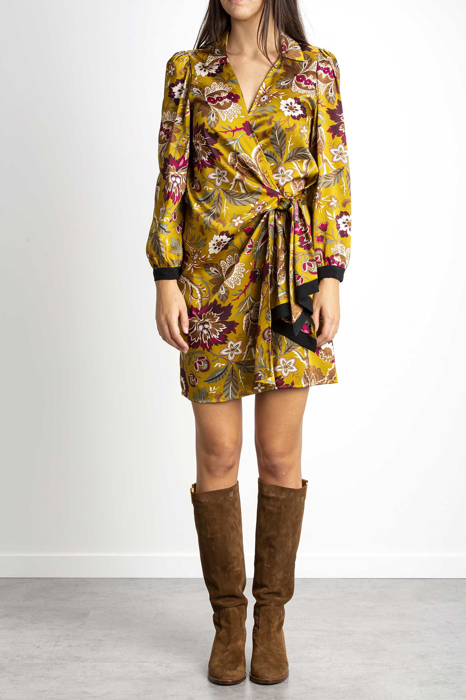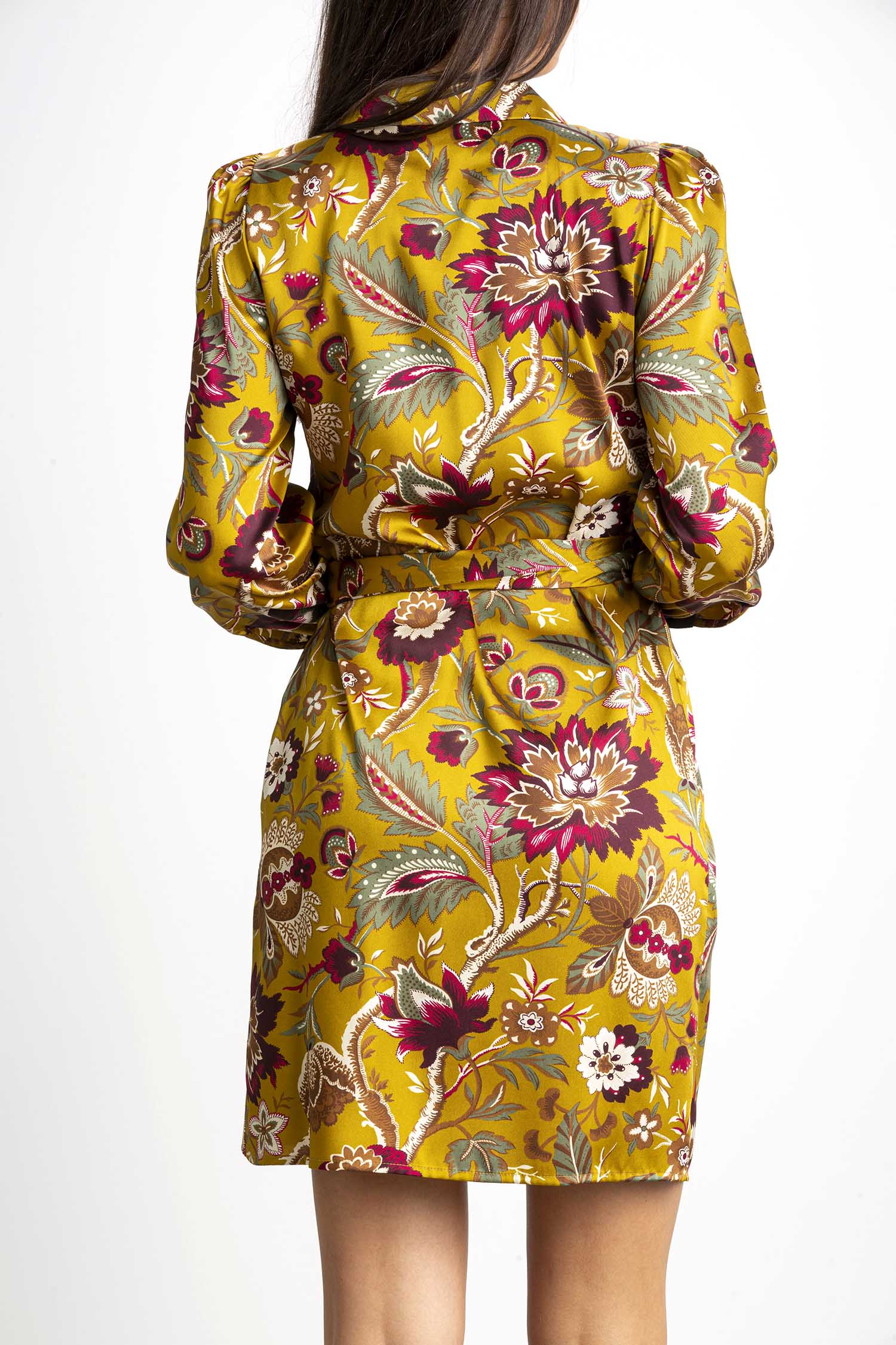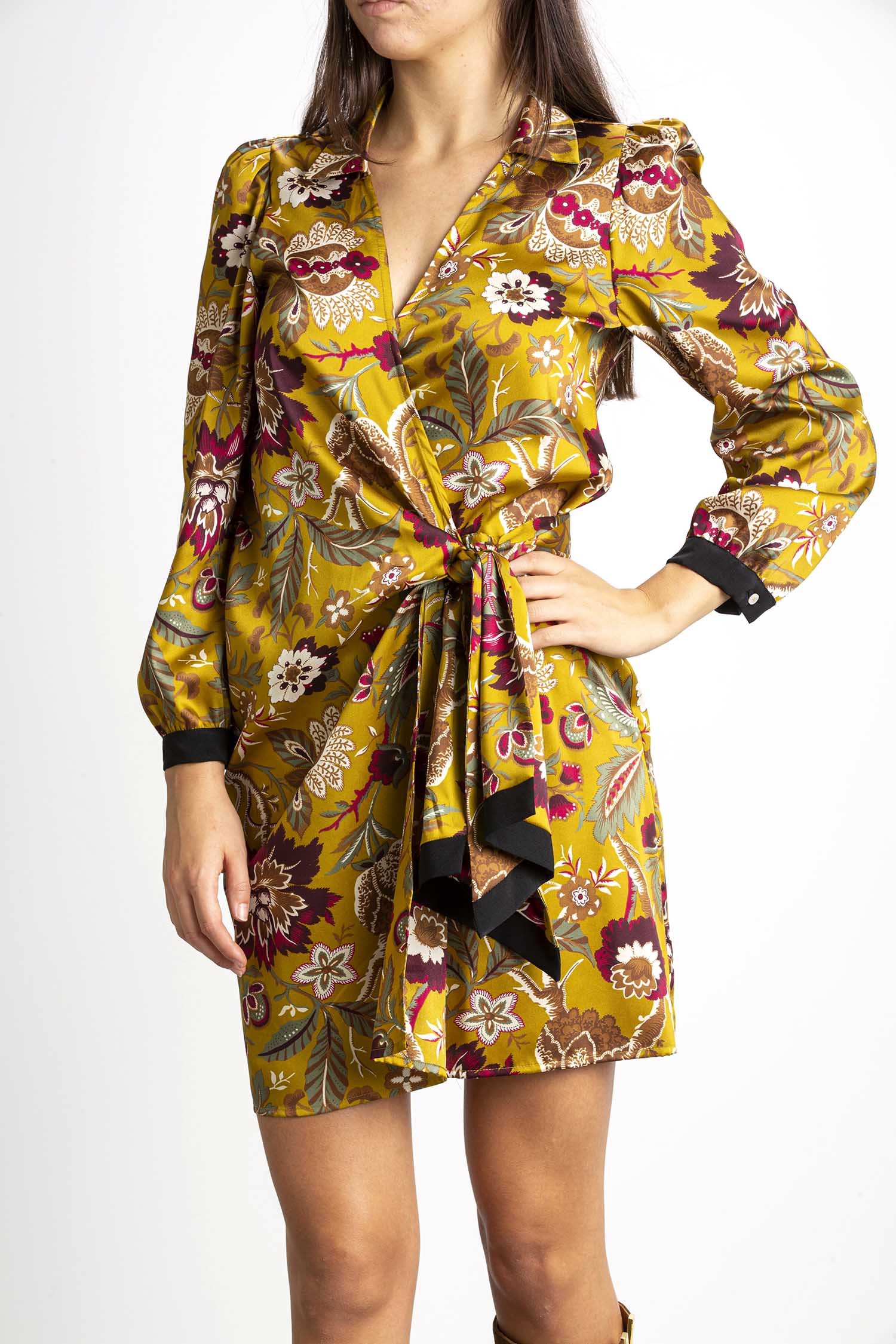 Abito corto in twill a fantasia, linea a portafoglio. Collo a camicia con scollo a V incrociato, maniche al gomito con polsino basso. Chiusura con fusciacca sul fianco.