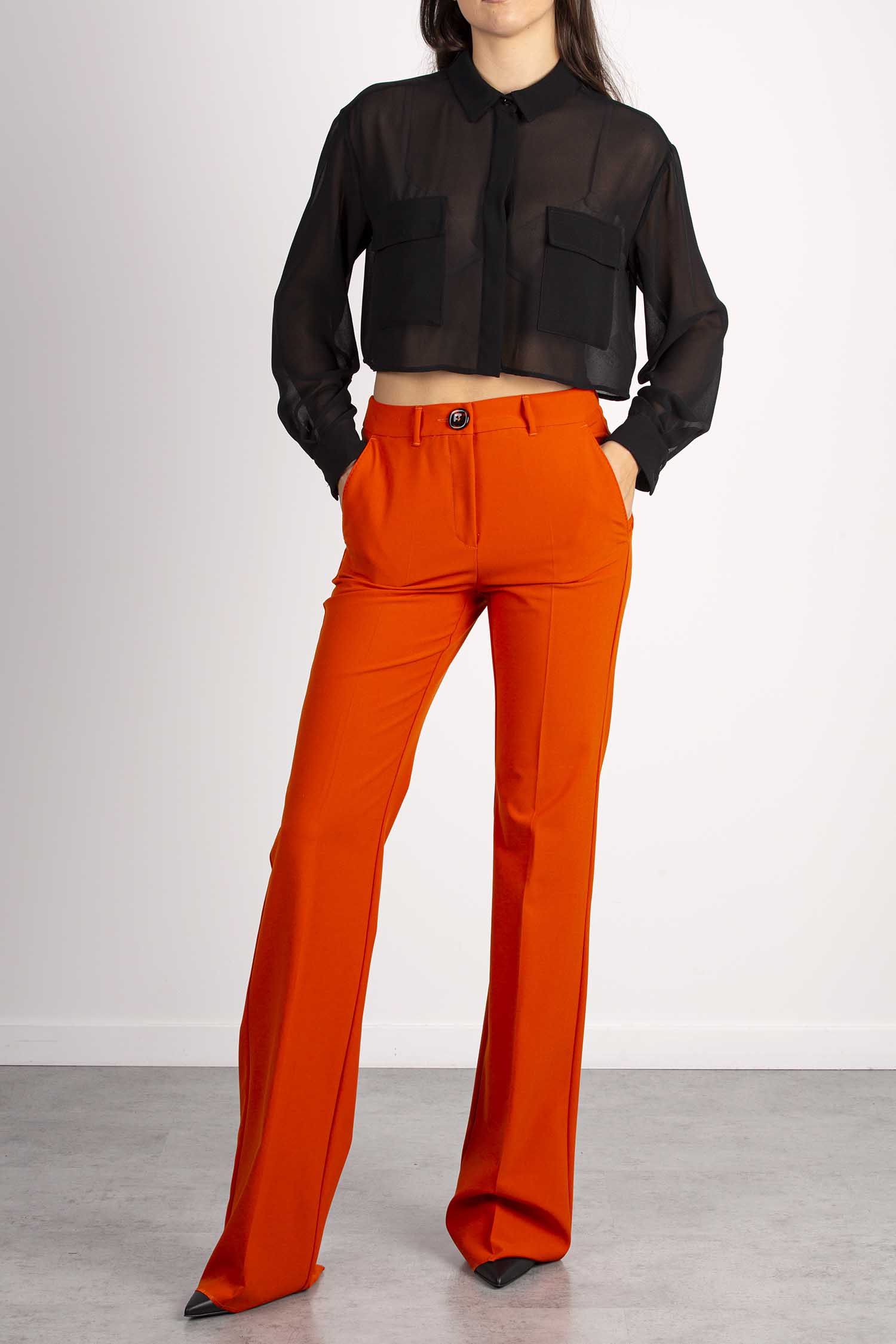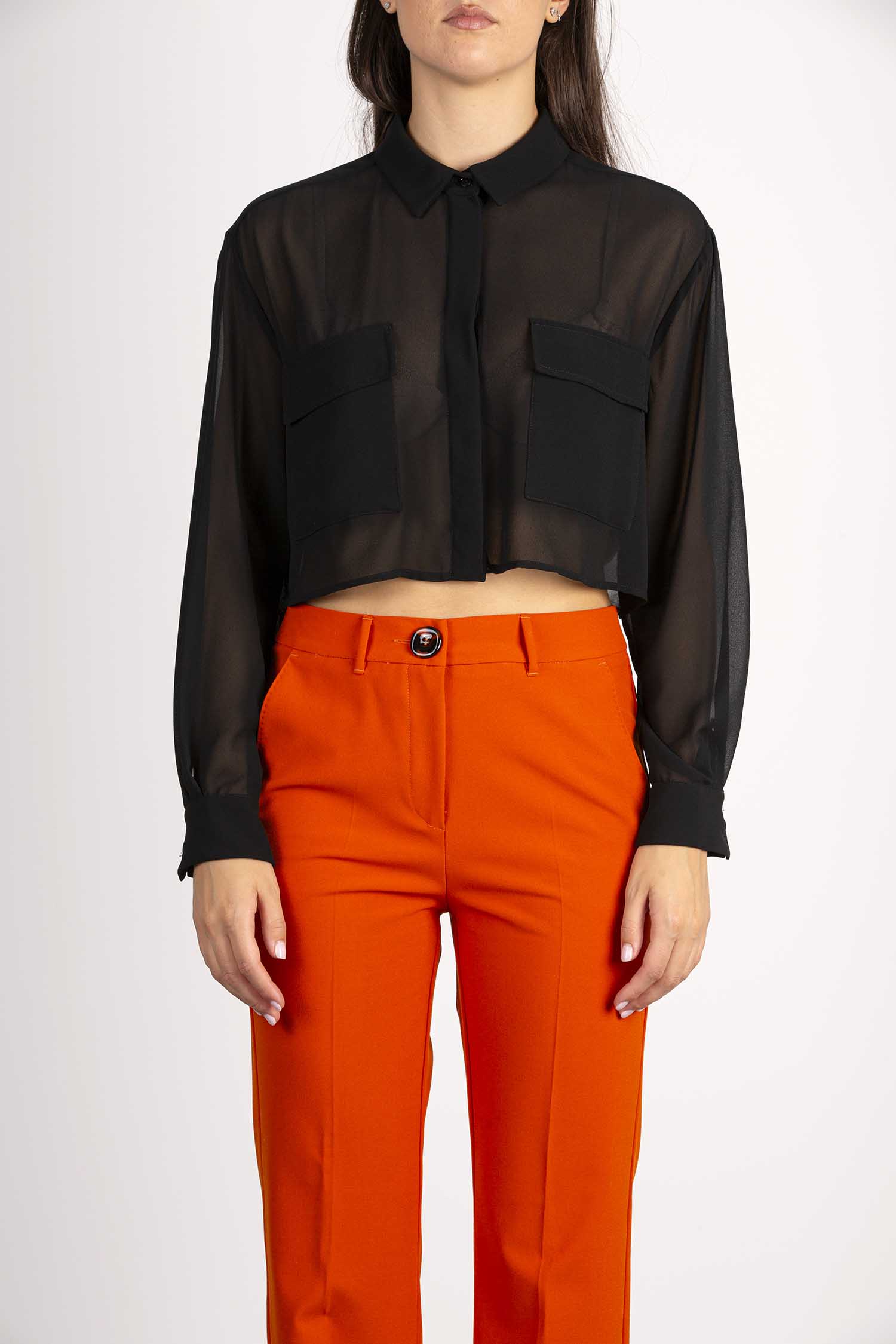 Collo a camicia, maniche lunghe con giro sceso e polsino. Chiusura con bottoni nascosti, tasche applicate con patta.