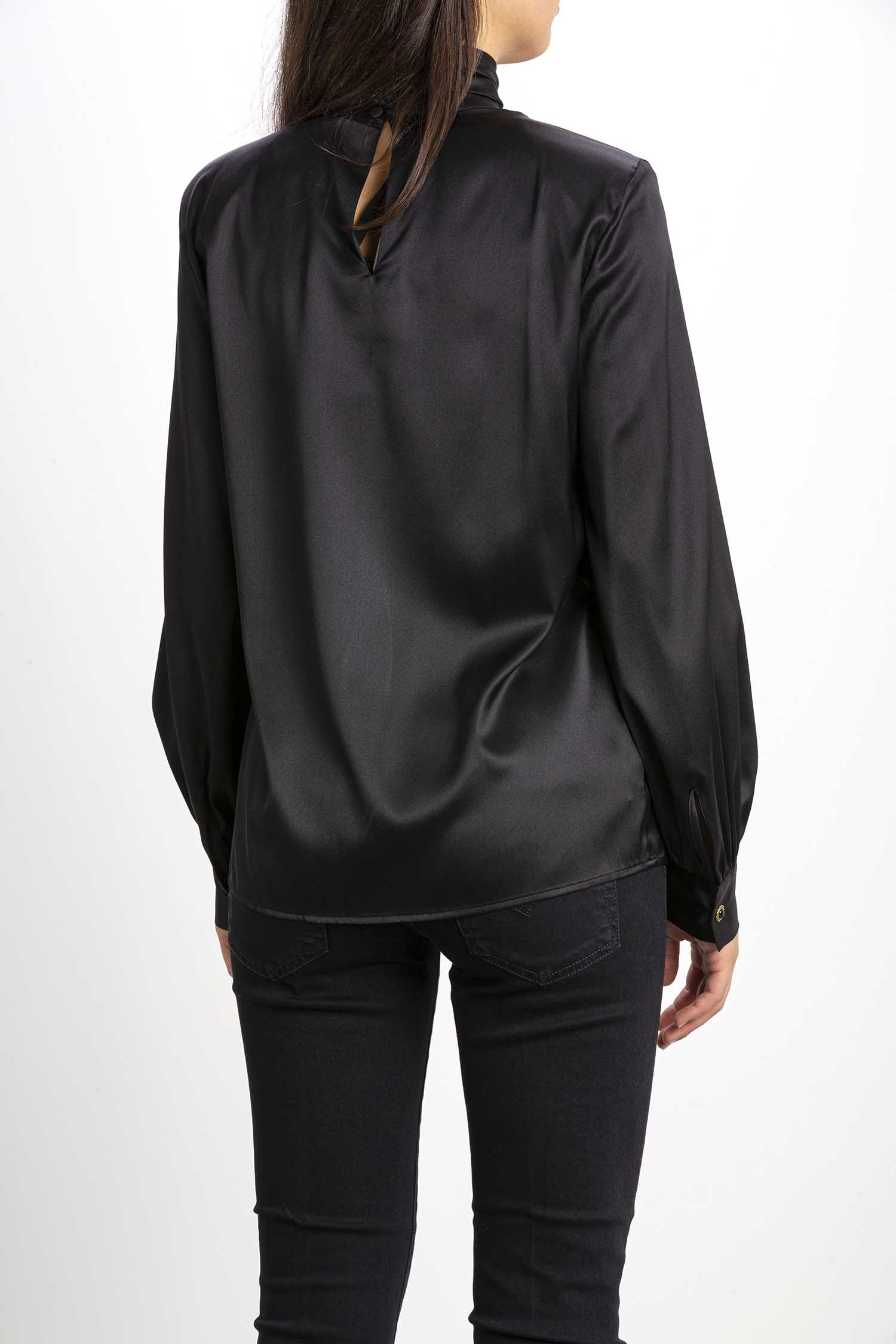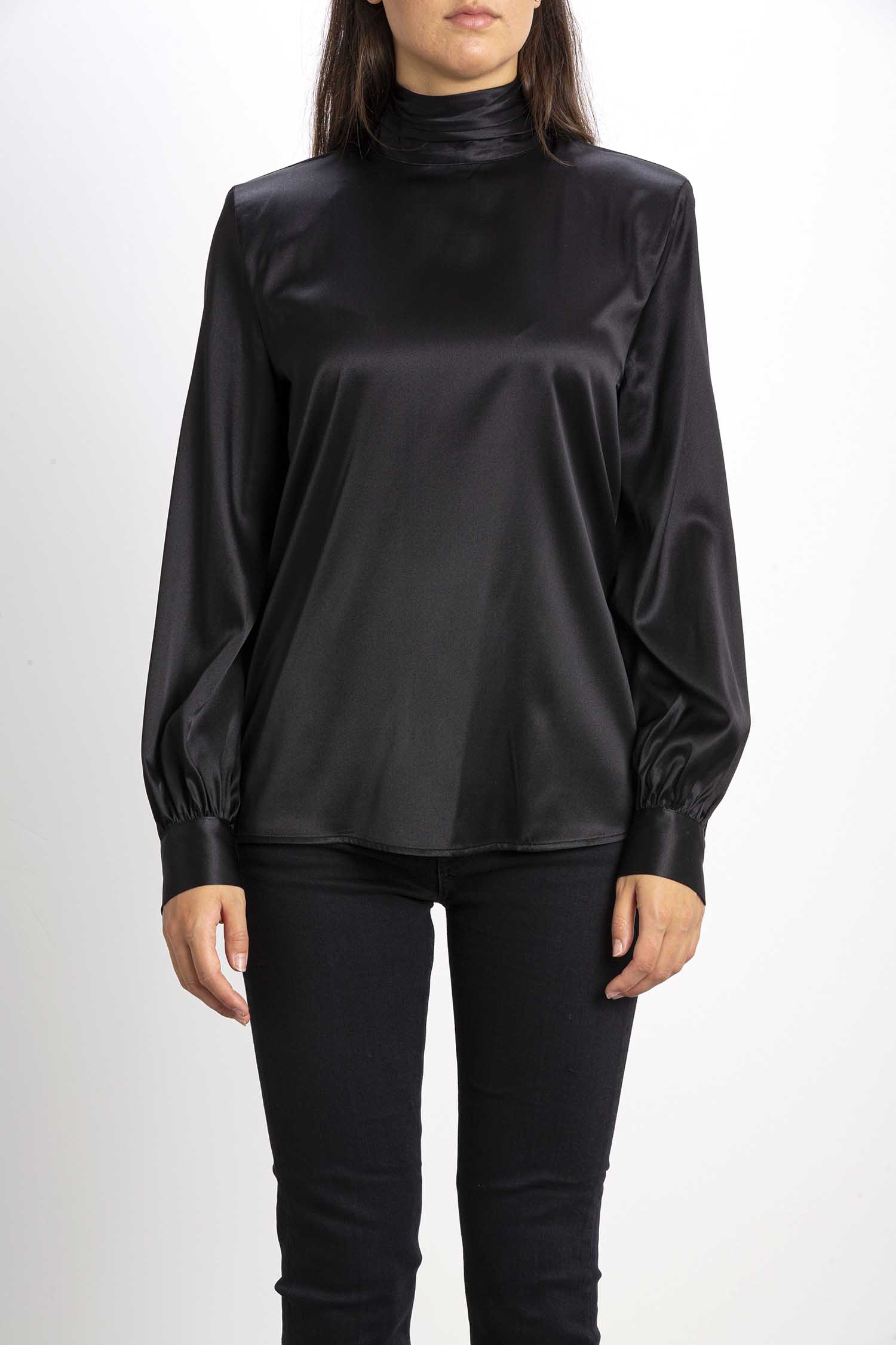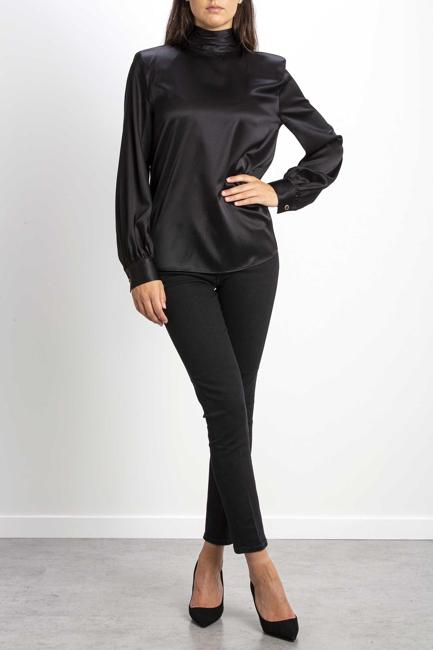 Blusa a maniche lunghe in satin di seta stretch con collo alto e apertura a goccia con piccoli bottoni sul retro.
