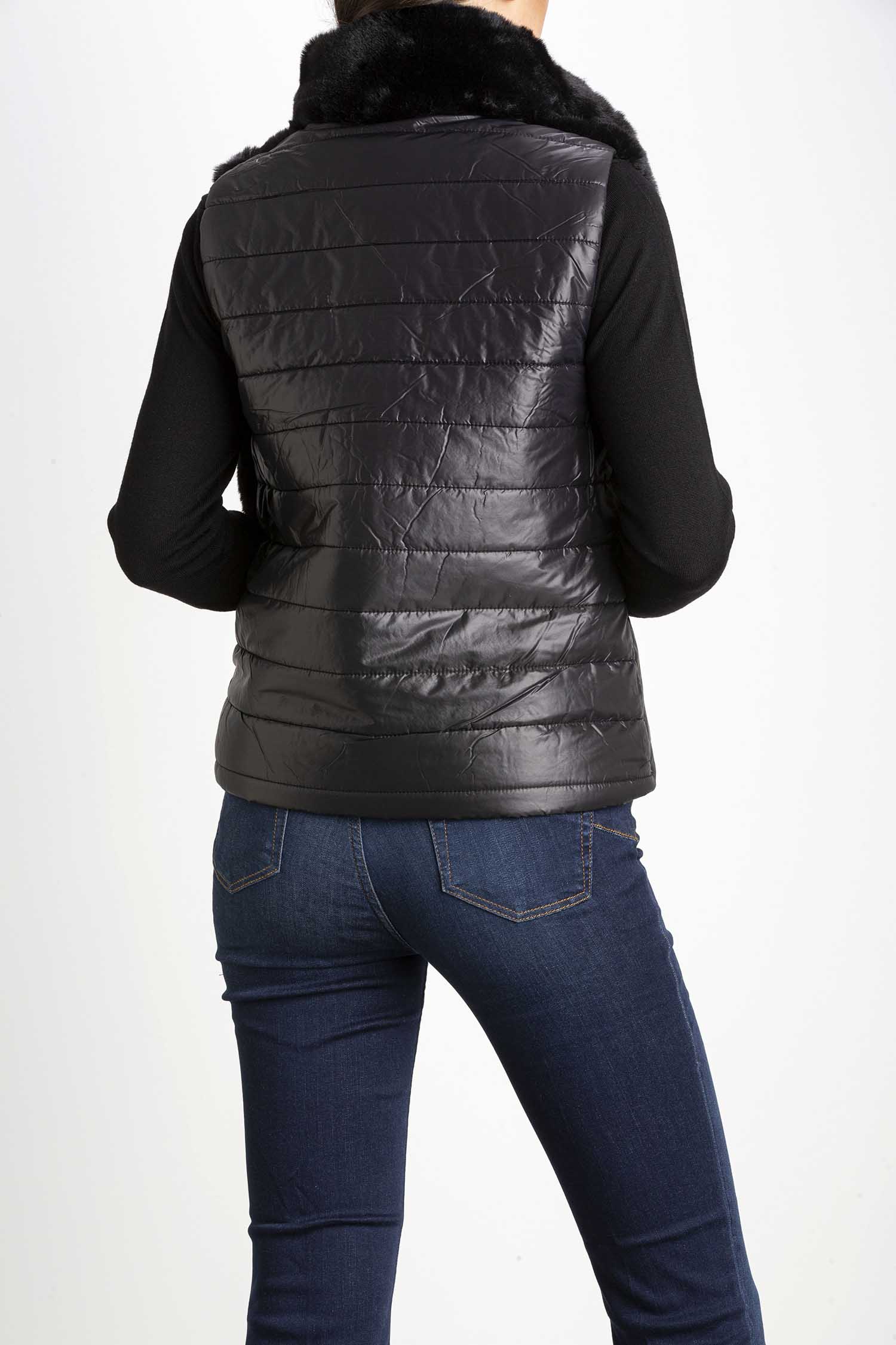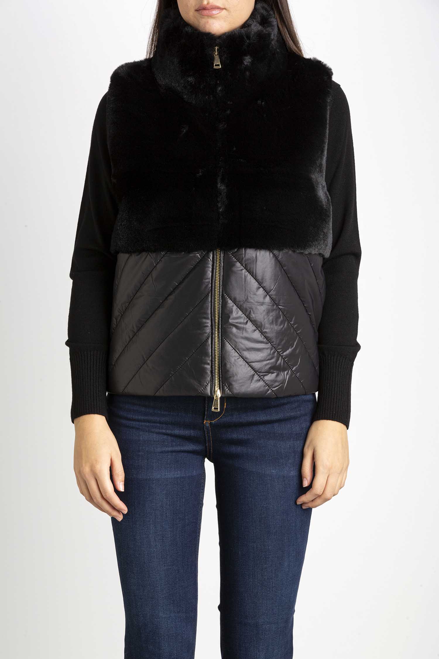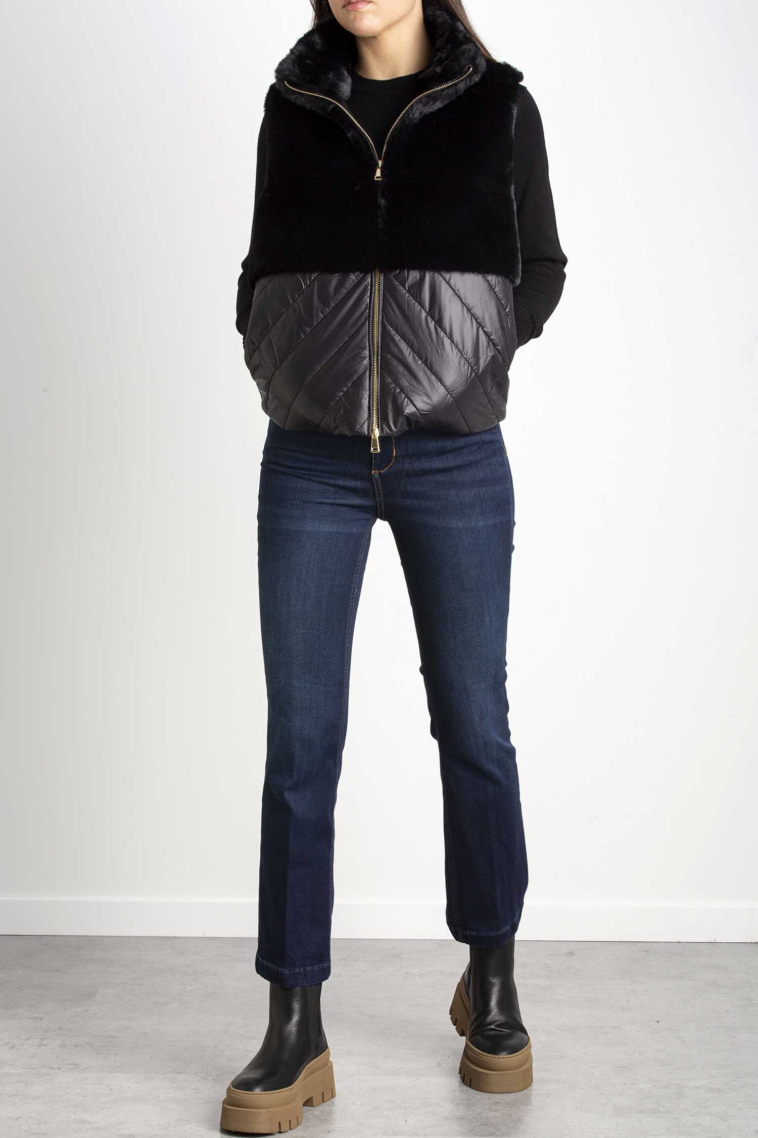 Gilet imbottito in tessuto tecnico trapuntato e texture morbida, linea dritta. Collo alto, senza maniche. Chiusura con zip a doppio cursore, tasche inserite sul fianco. Foderato.