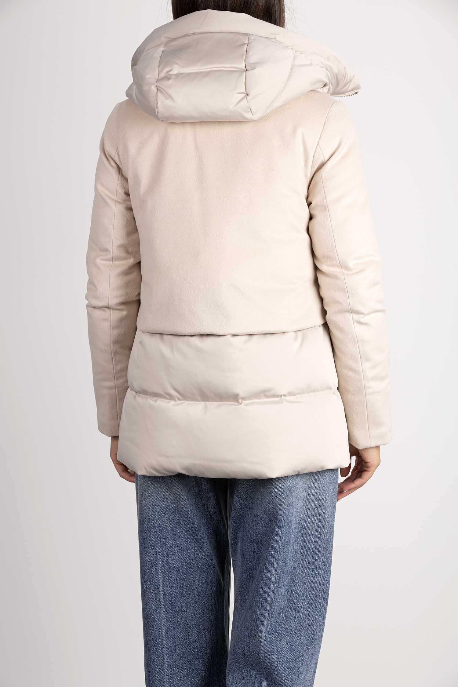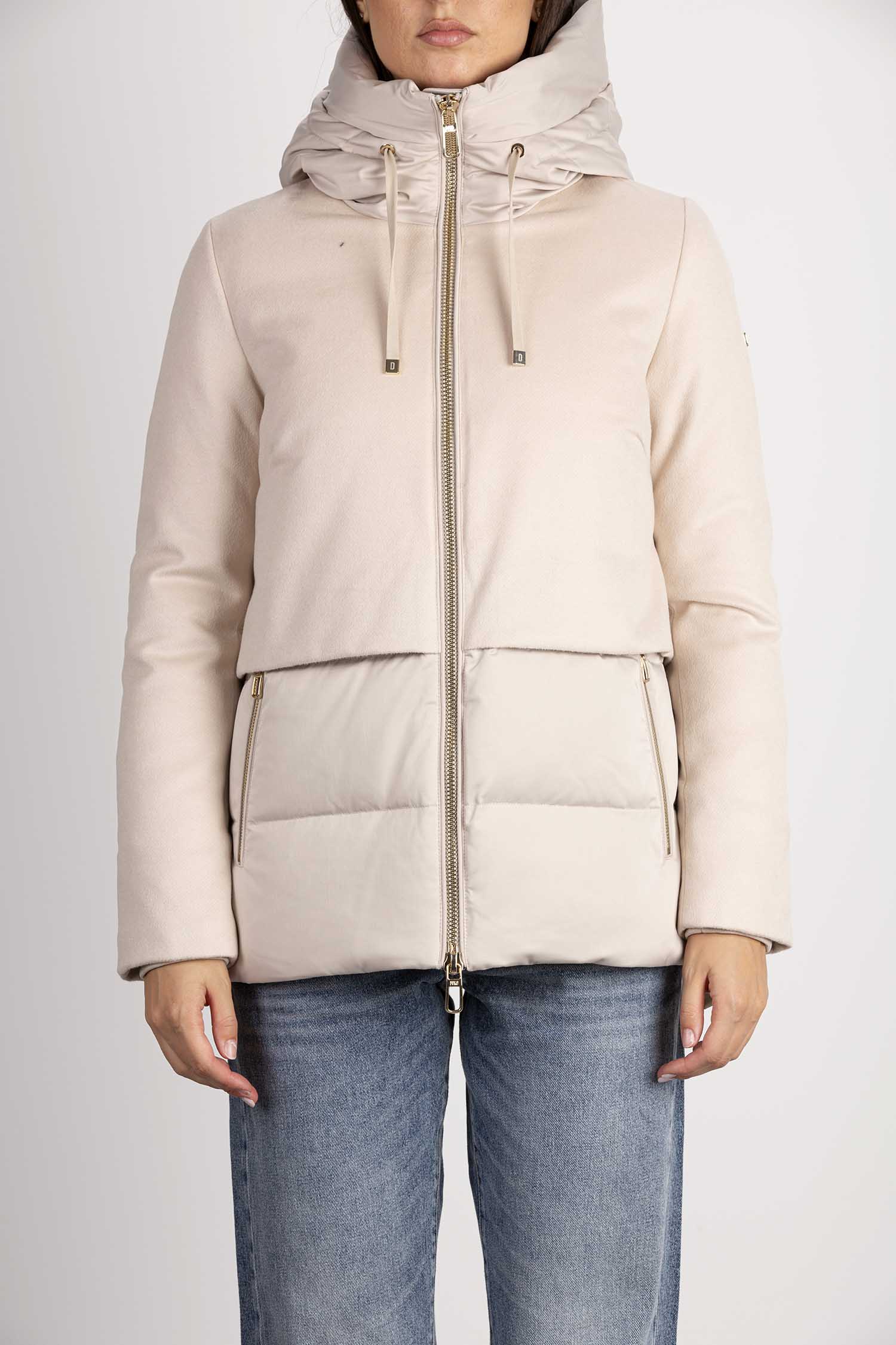 Parka corto realizzato con la combinazione di lana tecnica e raso.