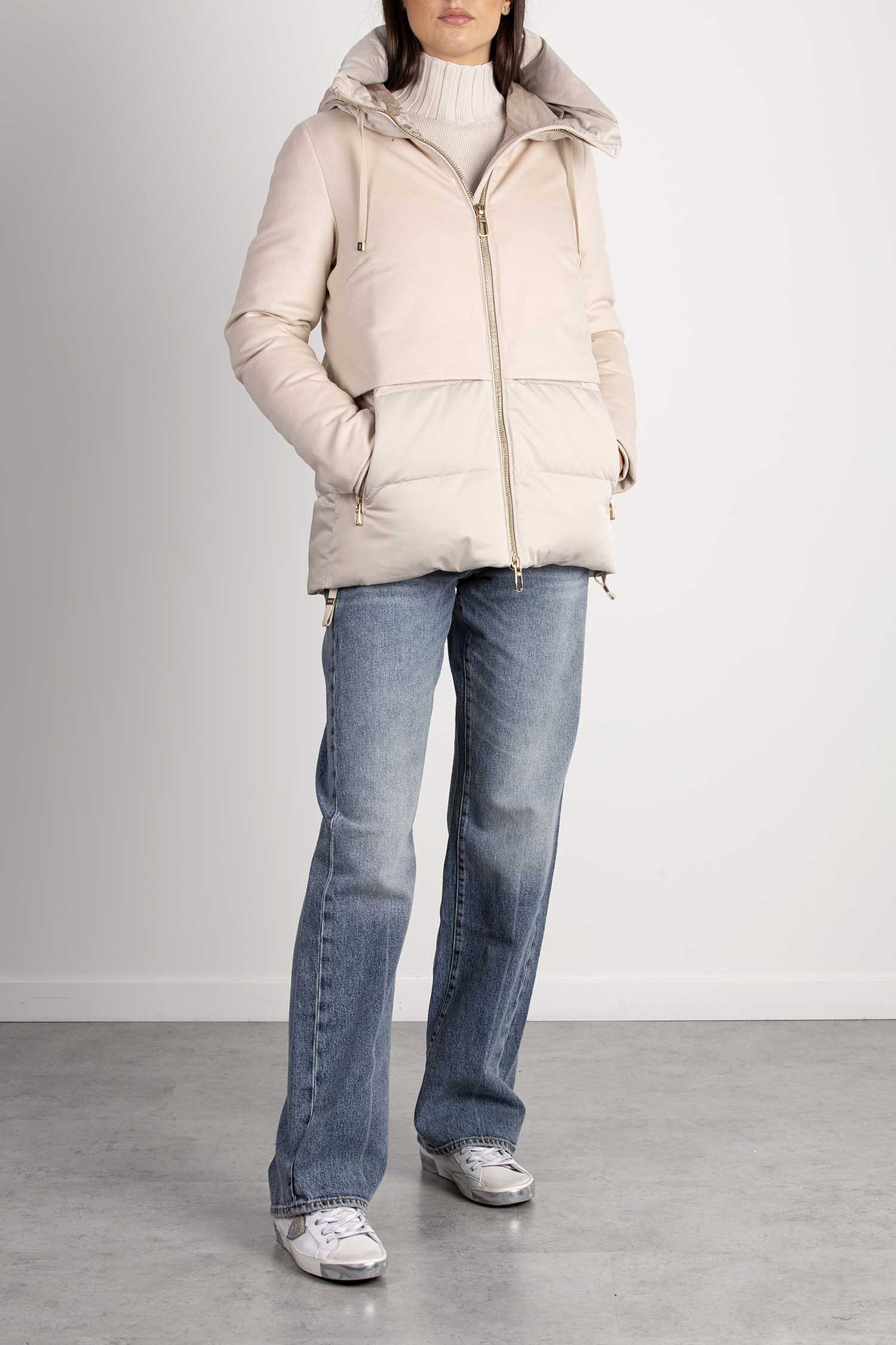 Utilizzata in combinazione con tessuto tecnico dalla struttura a raso con effetto serico con proprietà waterresistant e comfort stretch.