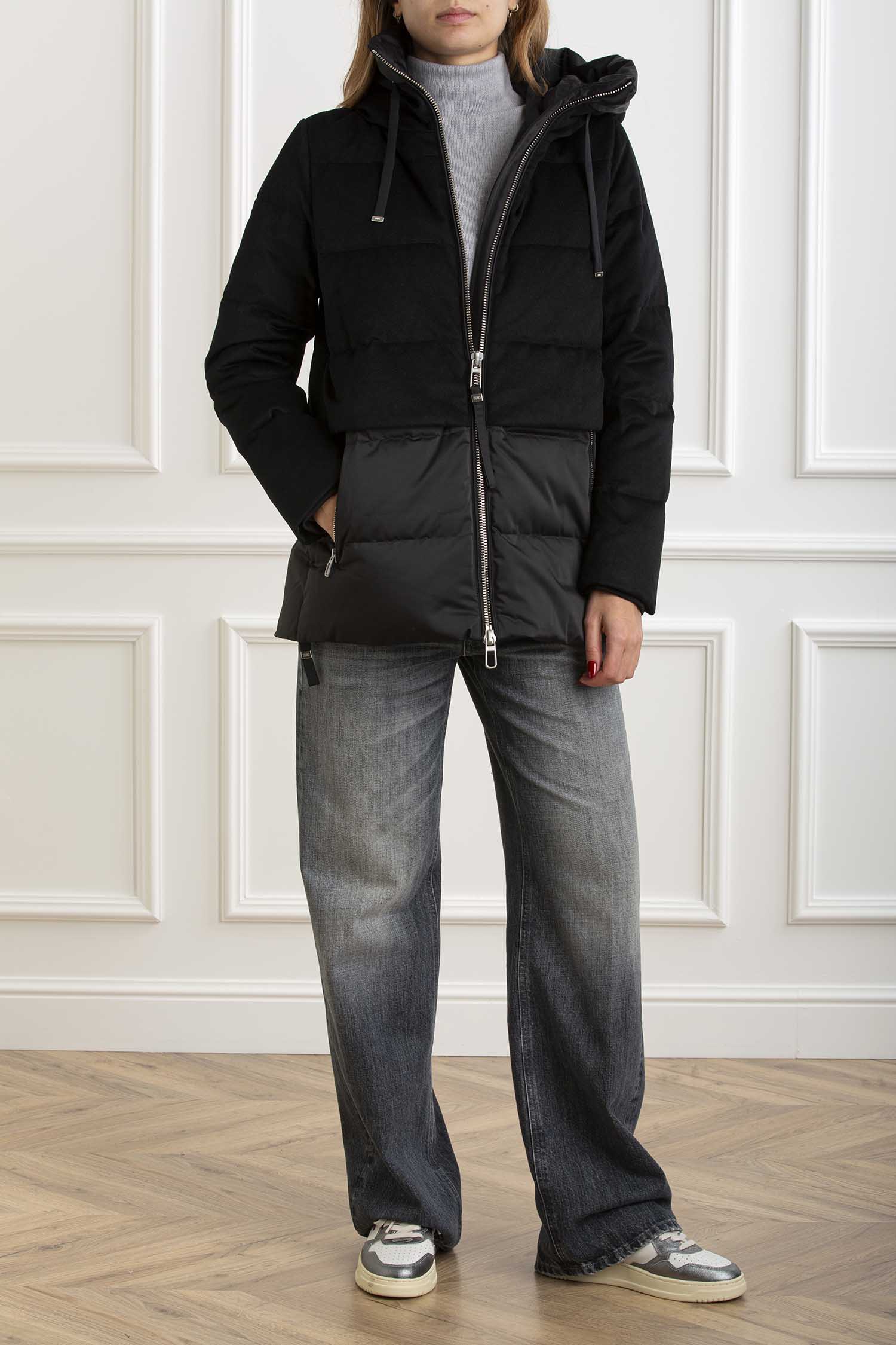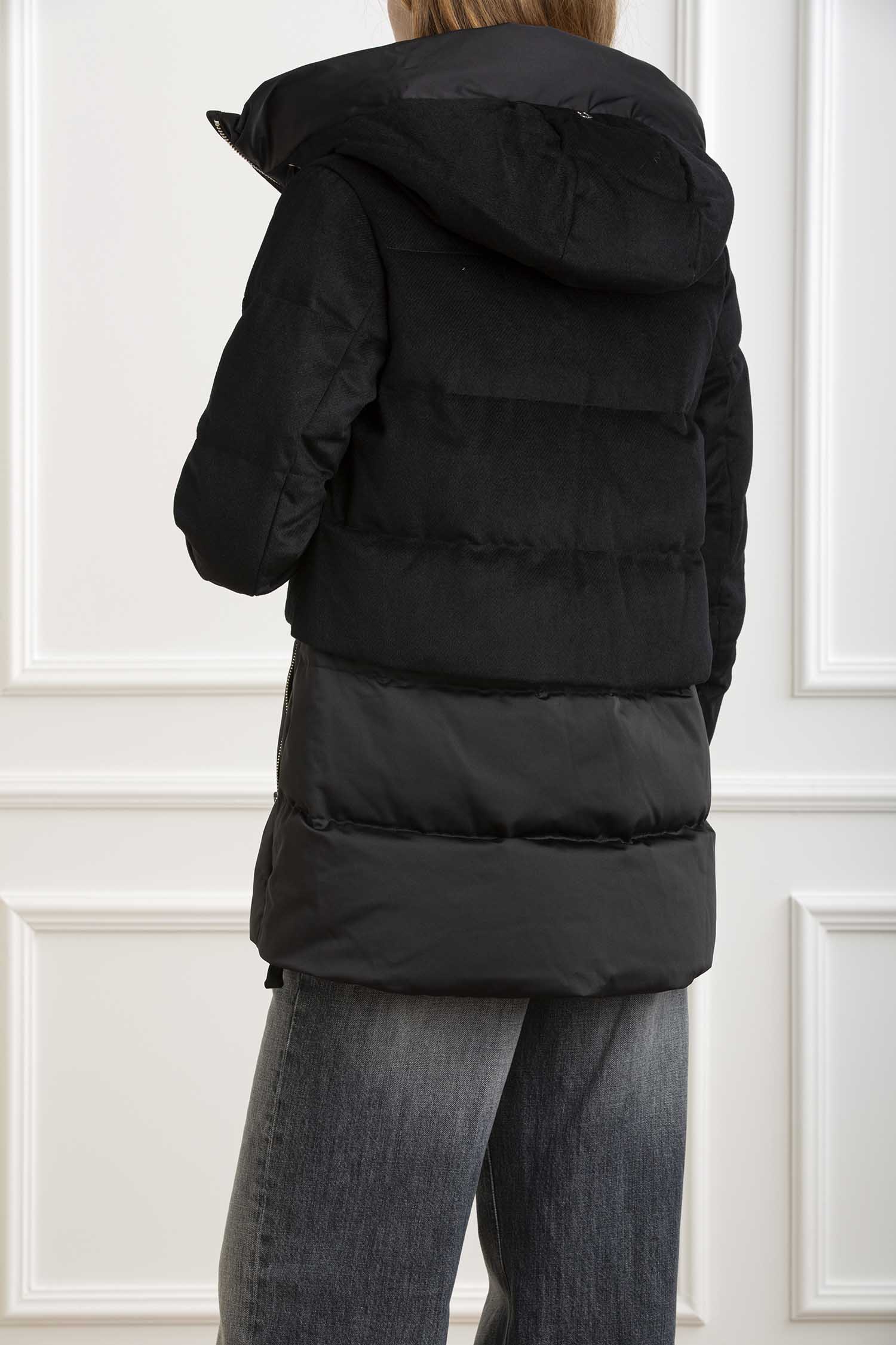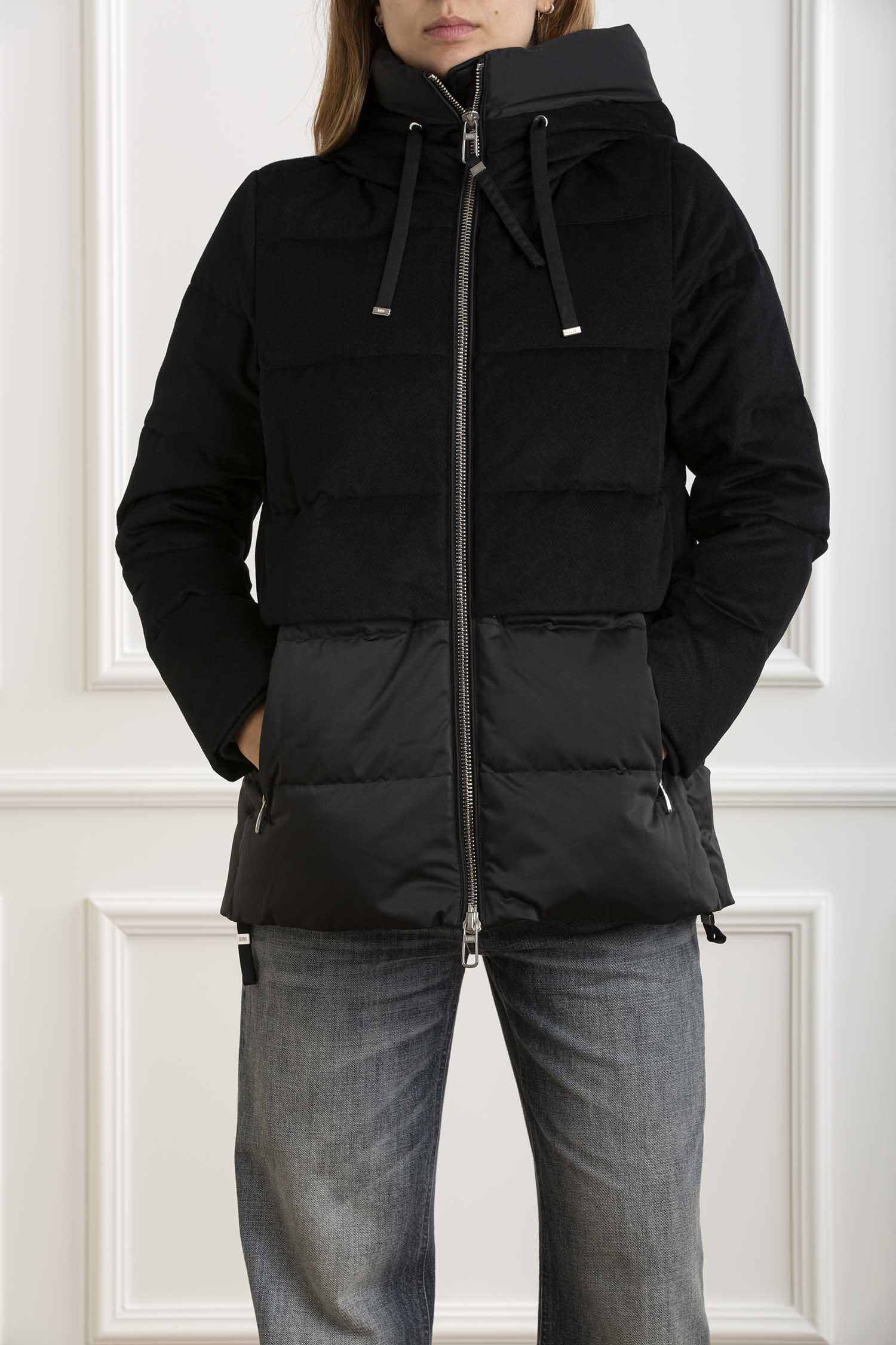Parka corto bimateriale con imbottitura in piuma realizzato con la combinazione di lana tecnica trapuntata e raso. Il capo è caratterizzato da ampio cappuccio imbottito regolabile con coulisse, chiusura frontale con zip metallica doppio cursore e tasche laterali con zip. Coulisse sul fondo per regolarne la vestibilità e polsino interno in maglia tecnica.