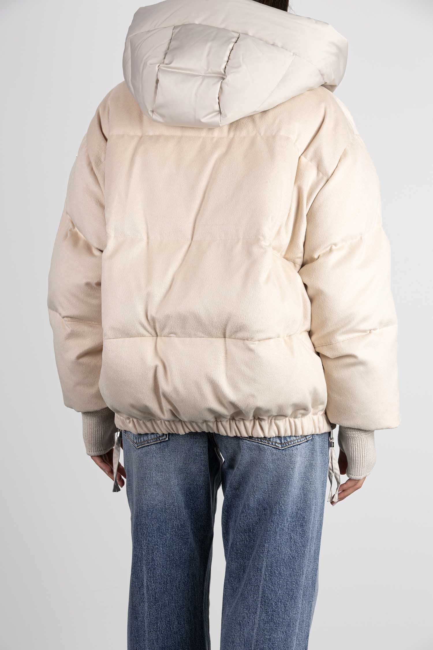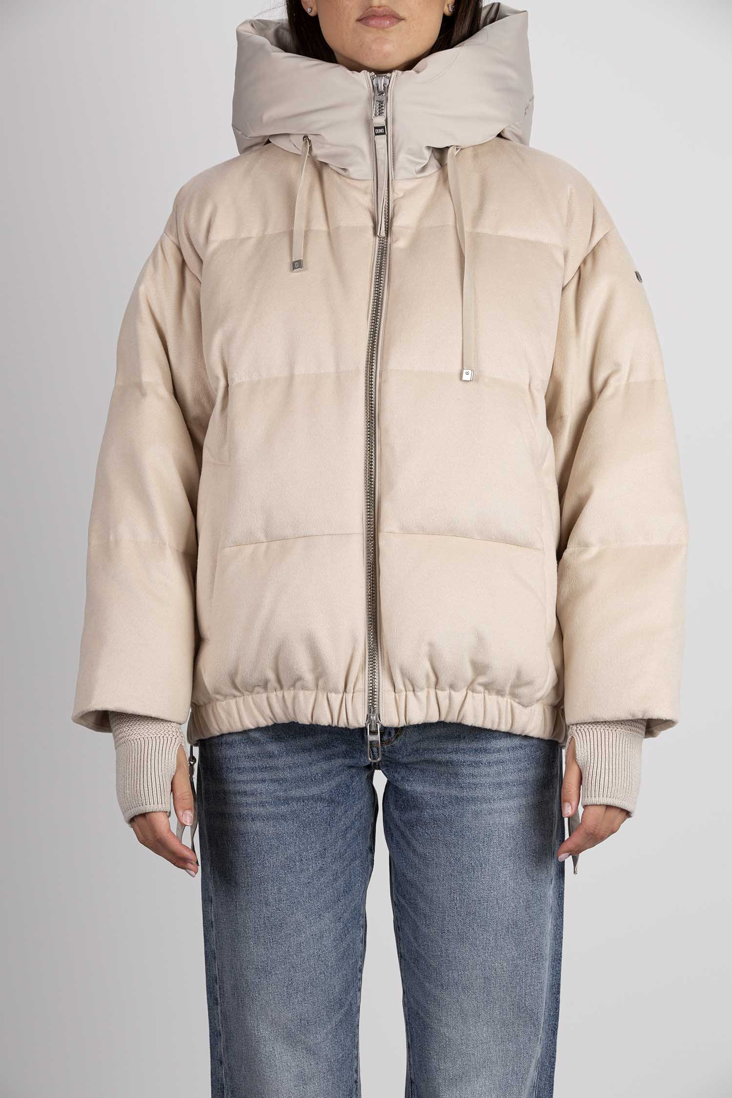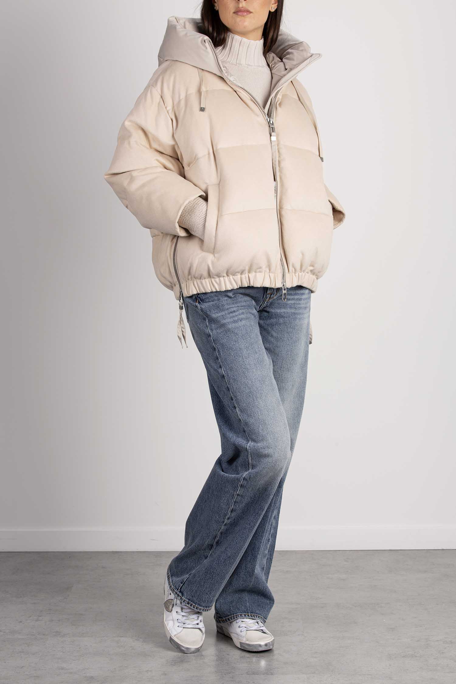 Piumino corto oversize in lana con cappuccio in raso tecnico, regolabile con coulisse.