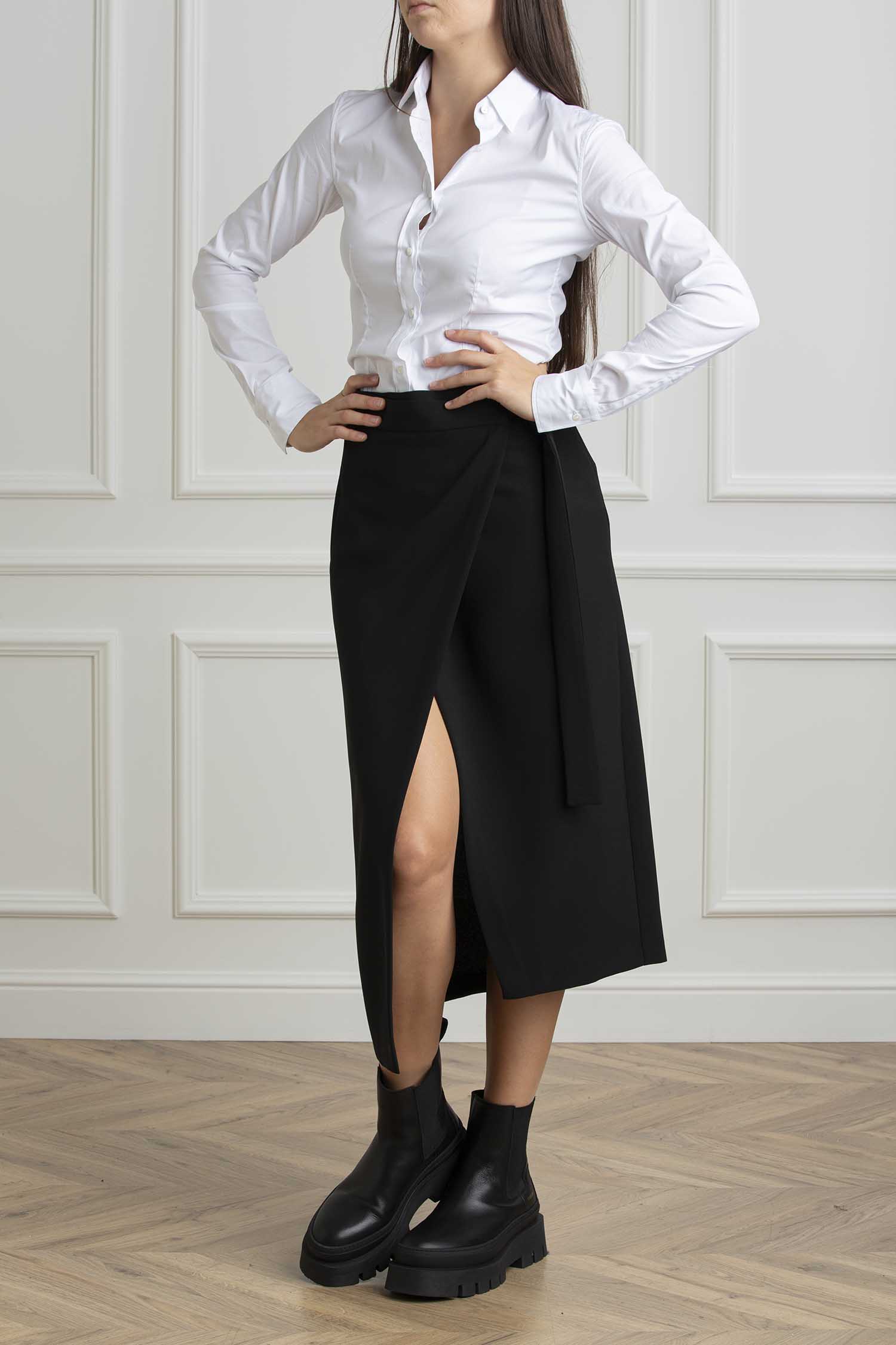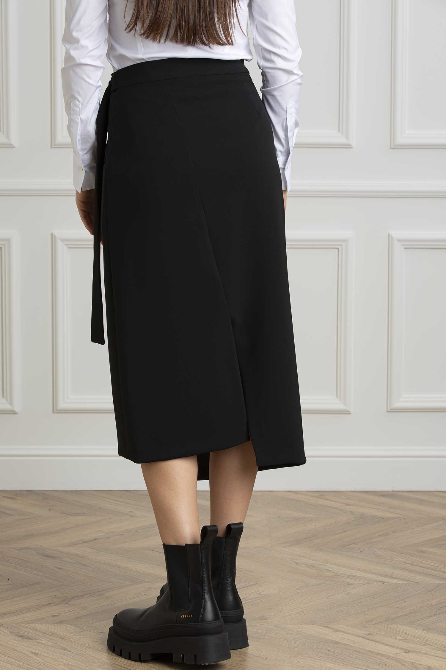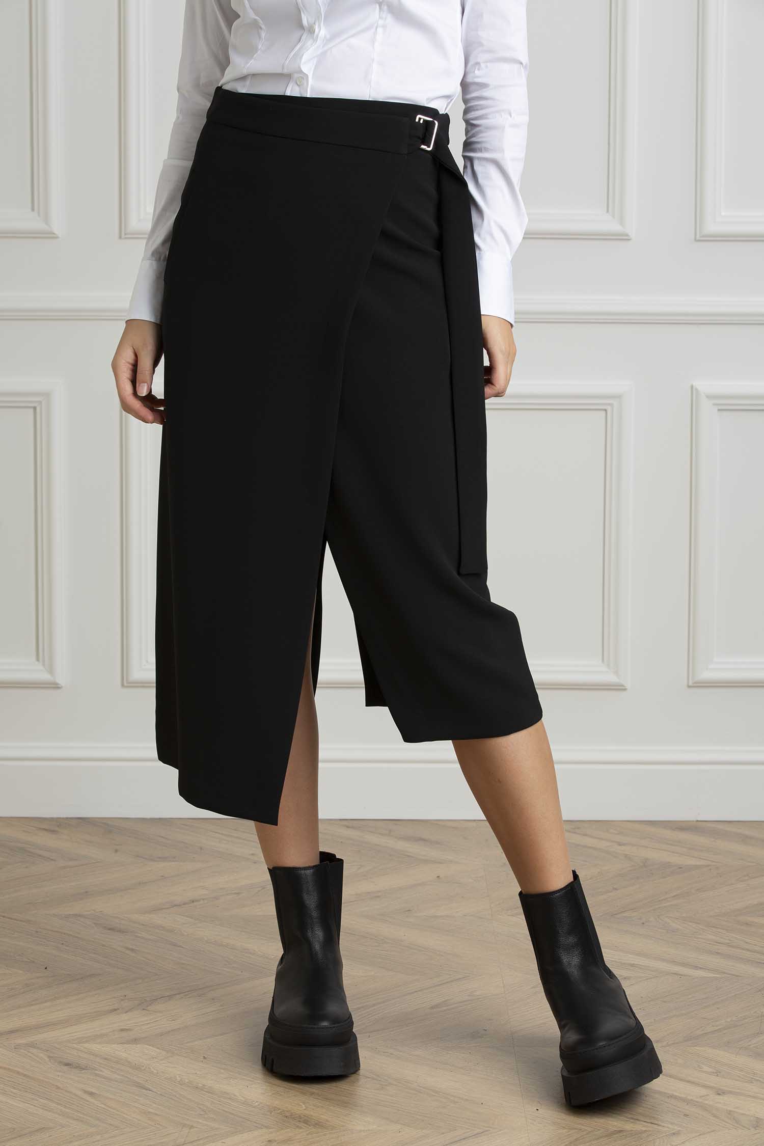 Gonna portafoglio lunghezza midi portafoglio con apertura laterale vita media con cintura e fibbia in metallo old nikel. Fondo asimmetrico davanti e spacco centrale sul dietro. Regular fit.