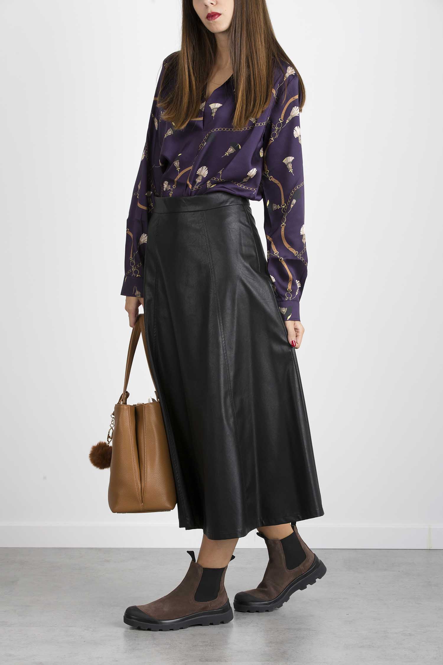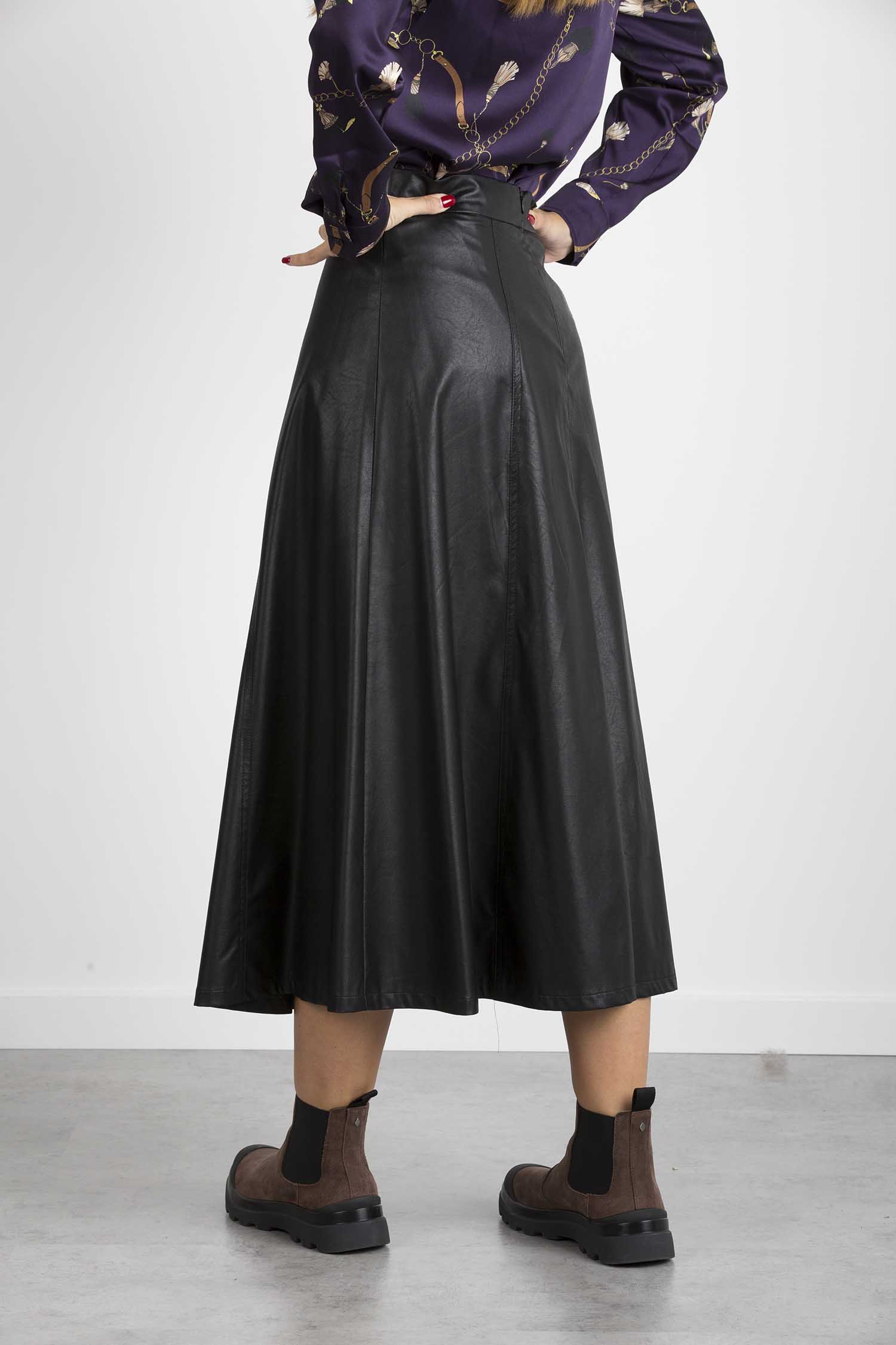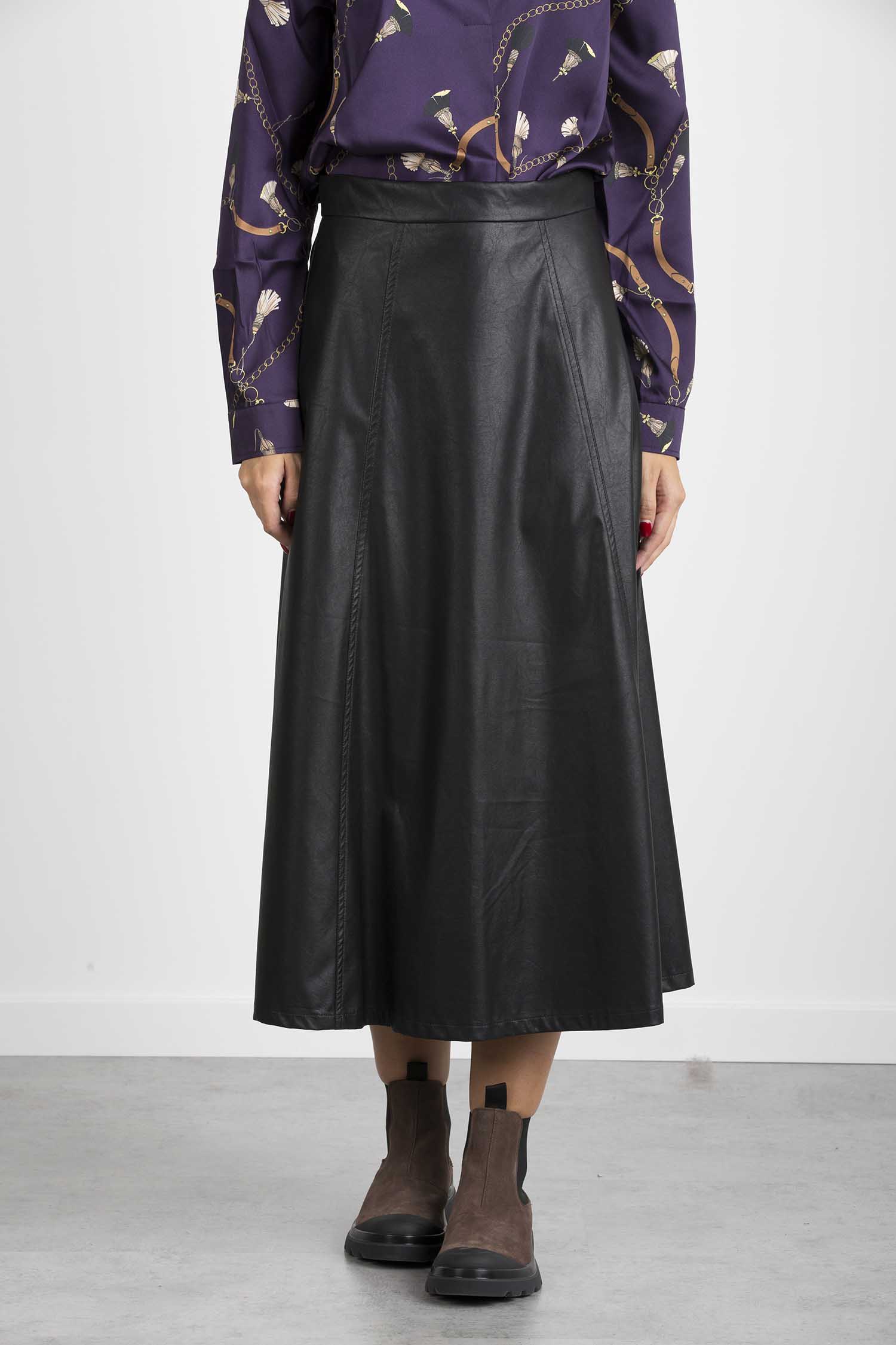 Gonna in tessuto spalmato, linea svasata. Chiusura con zip invisibile sul retro.