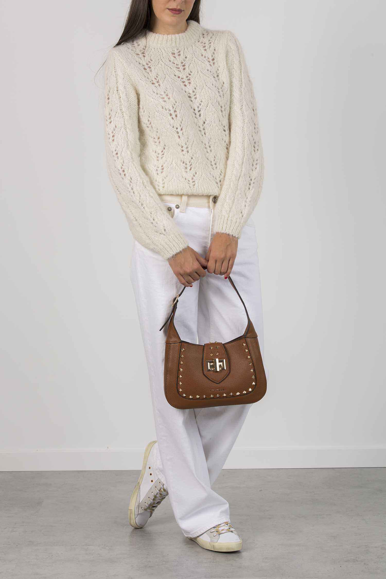 Jeans cinque tasche Karen, wide leg fit, vita alta e lunghezza regolare. Contrasti su cinta e tasche. Bull di cotone stretch. Tintura in capo. Logo Dondup. Made in Italy
