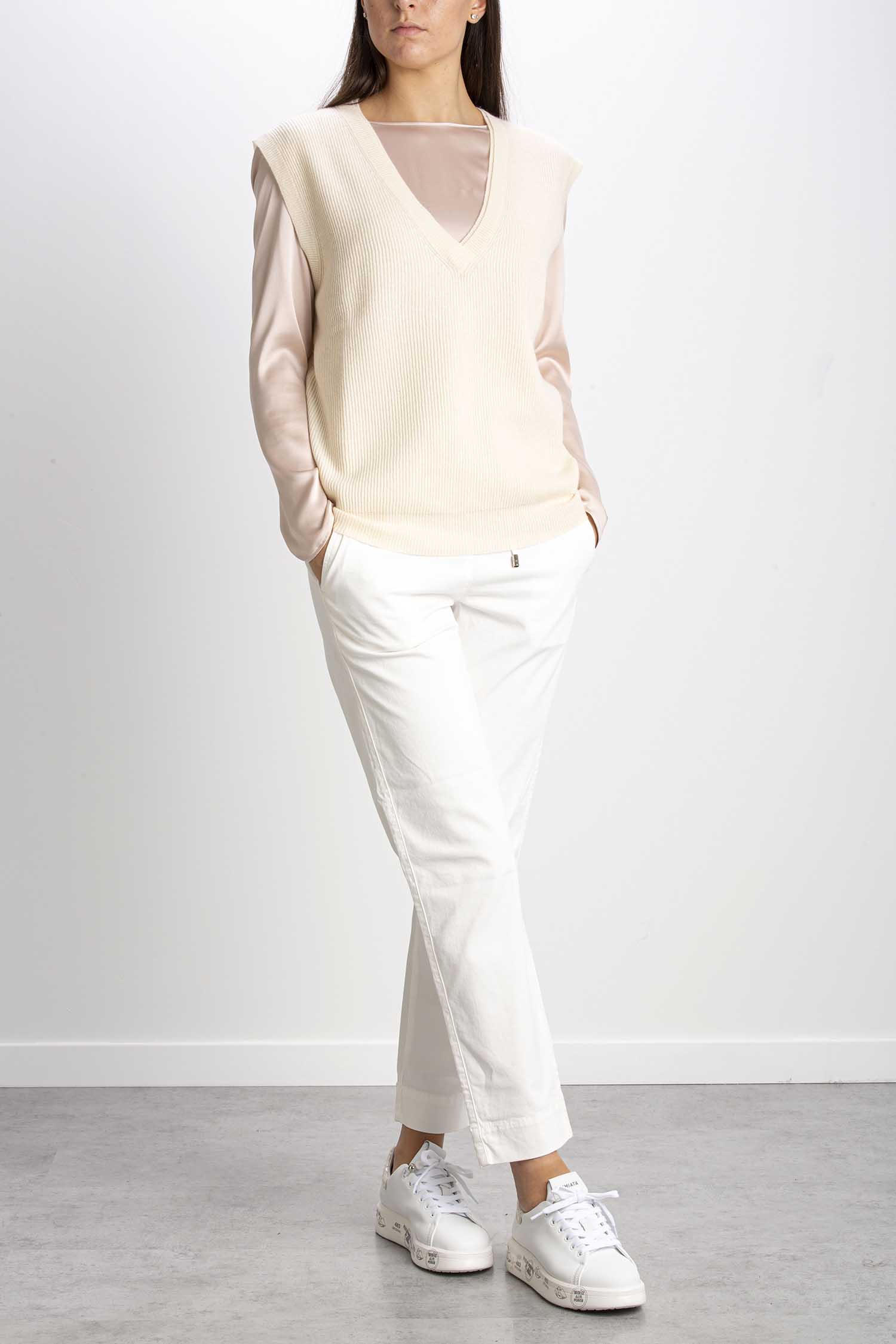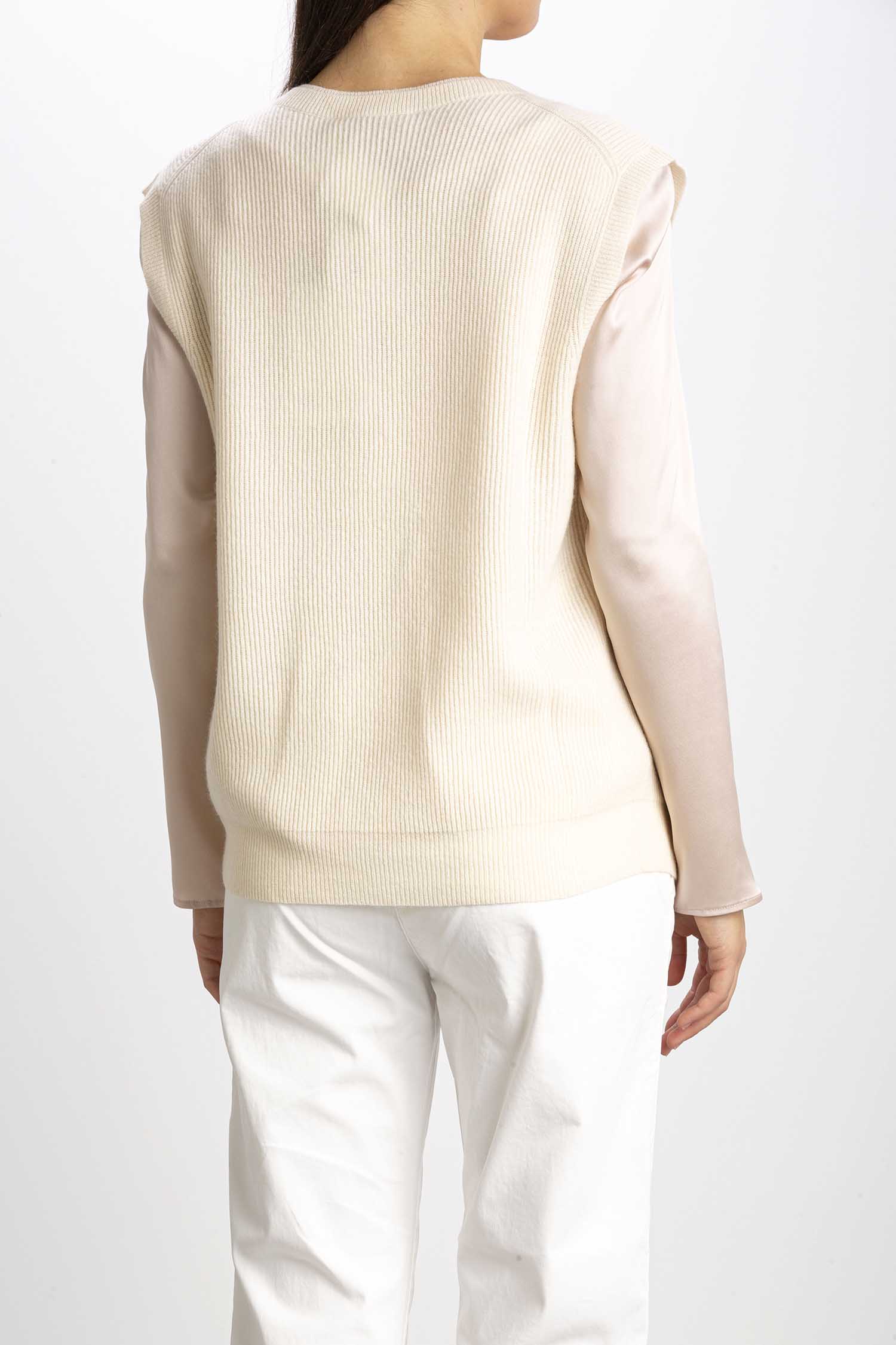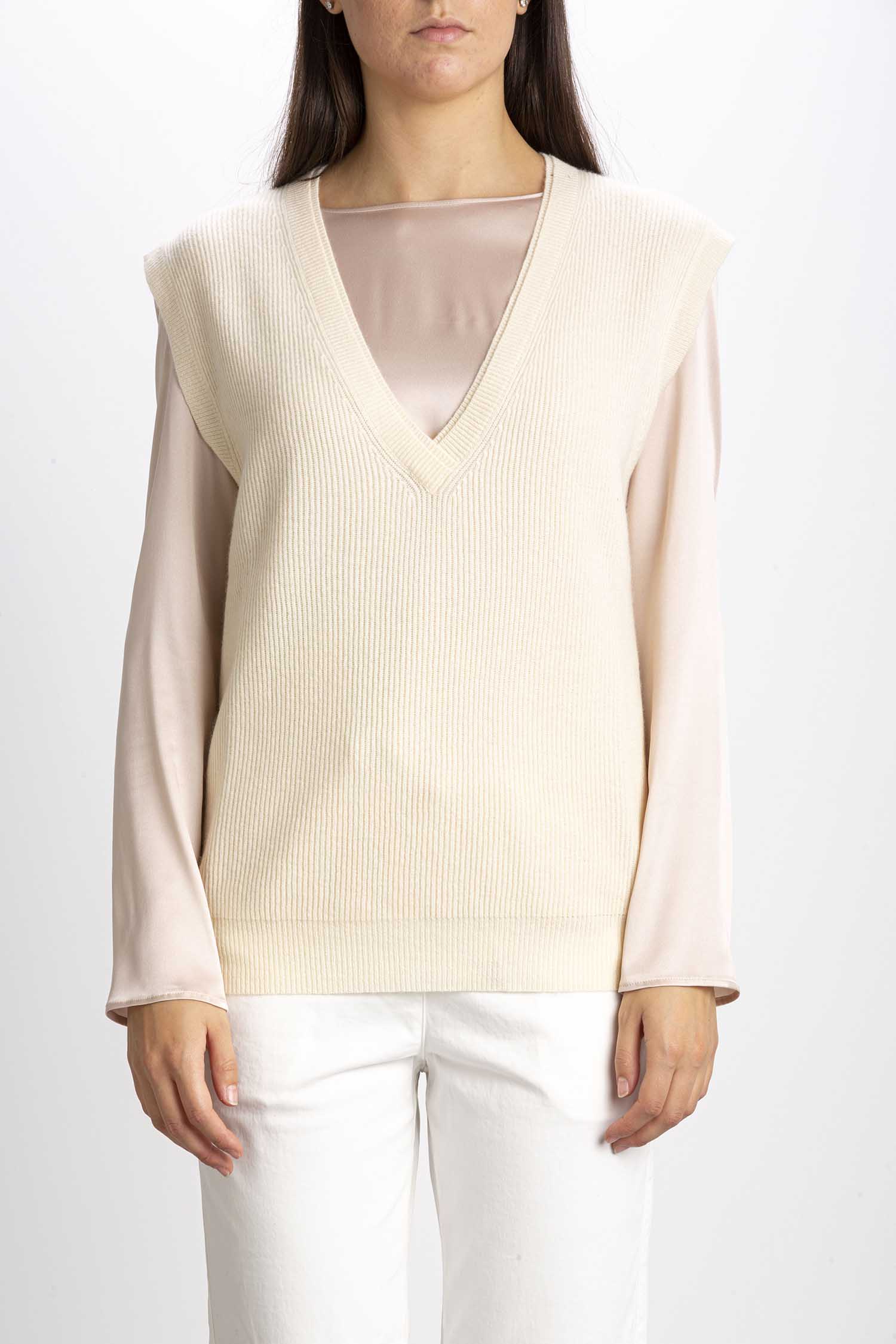 Gilet in filato di lana e cachemire con scollo a V e maniche ad aletta. La lavorazione a costa inglese caratterizza la texture. Bordi rifiniti a costine.
