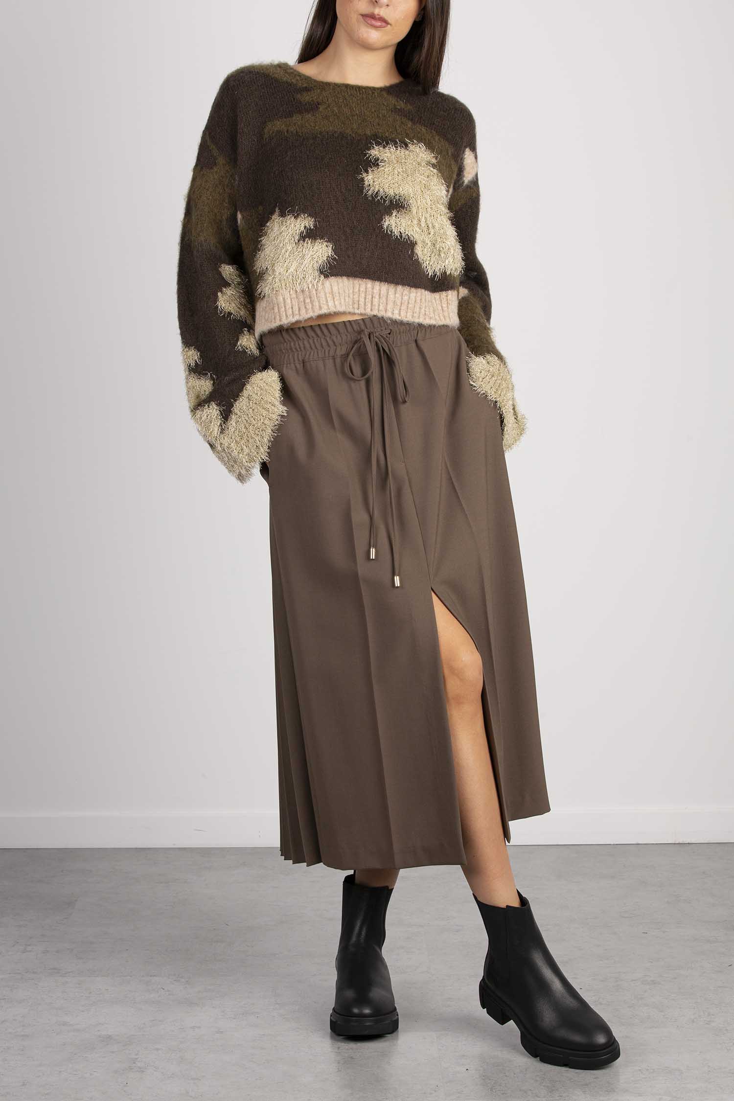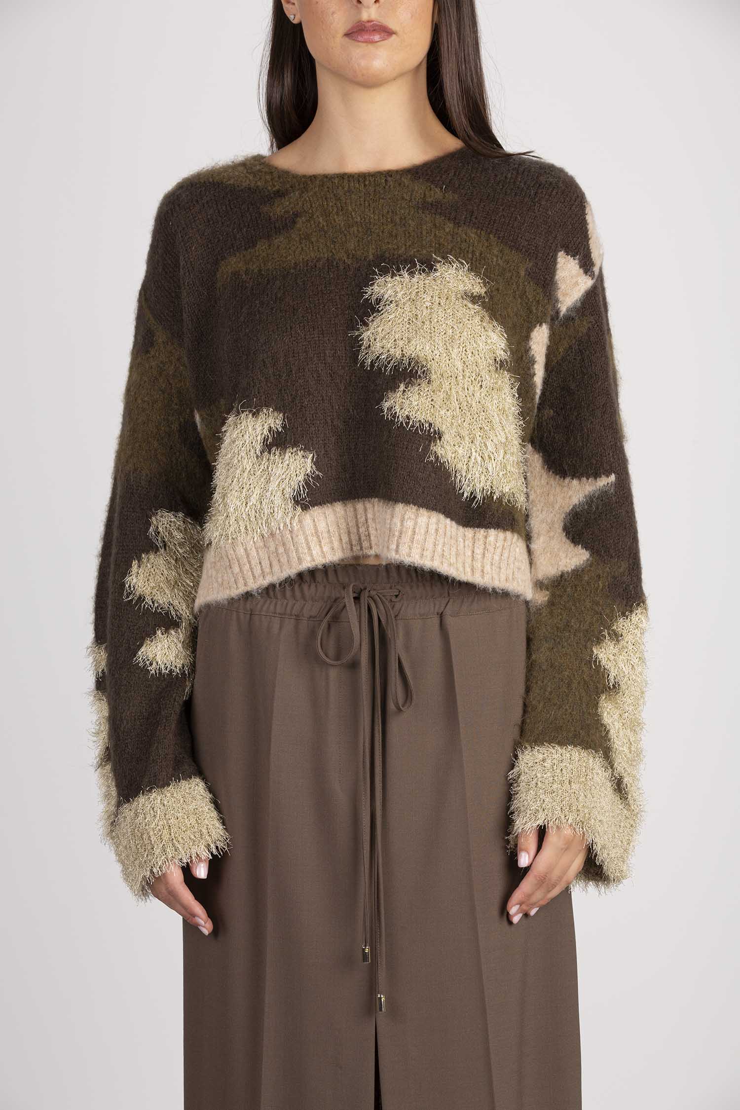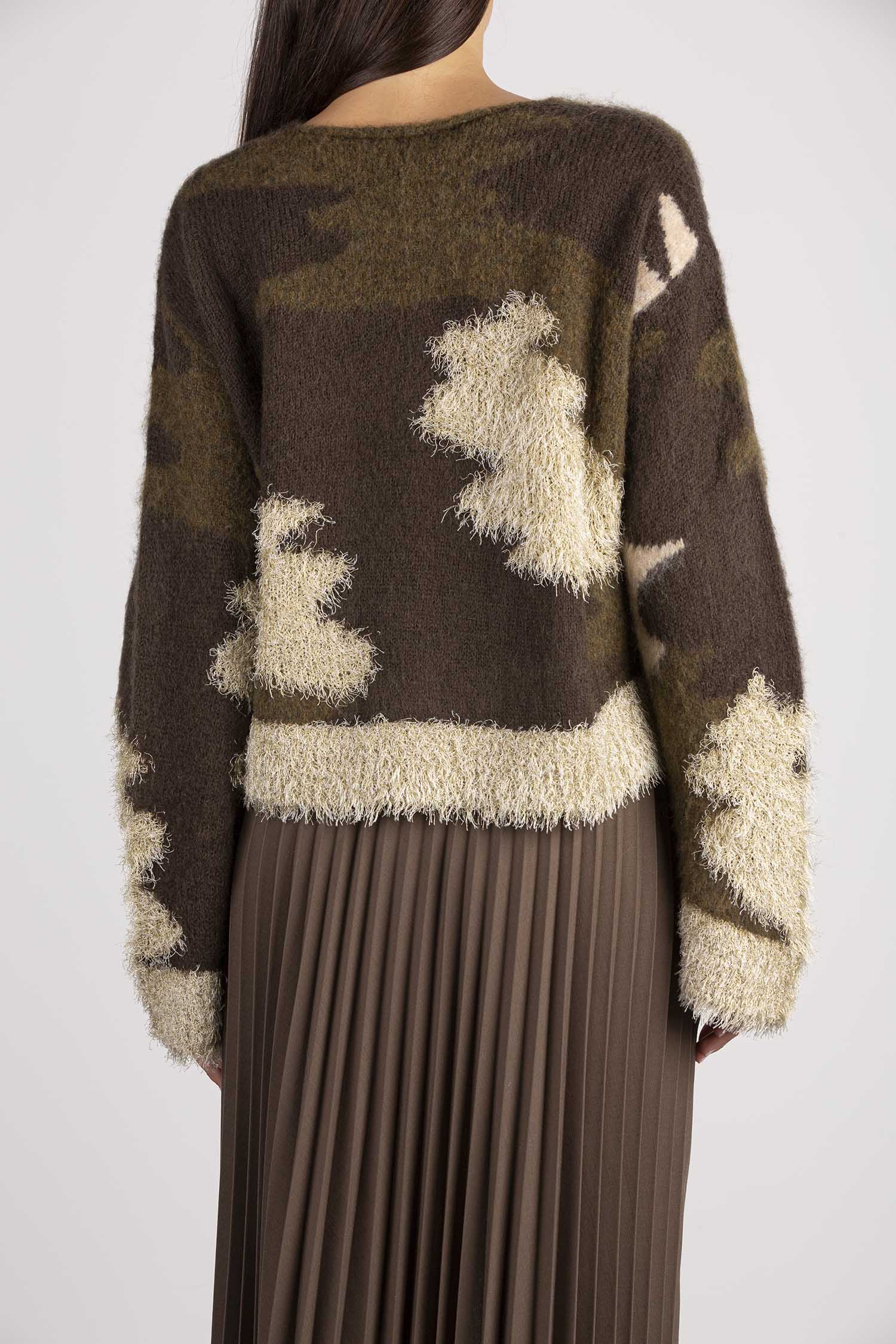 Maglia girocollo camouflage. Scollo quadrato, manica lunga con spacco su polsi. Volume regular, lunghezza vita.