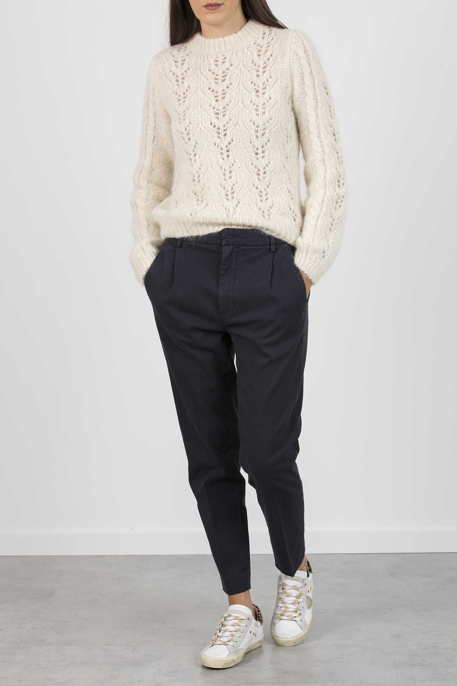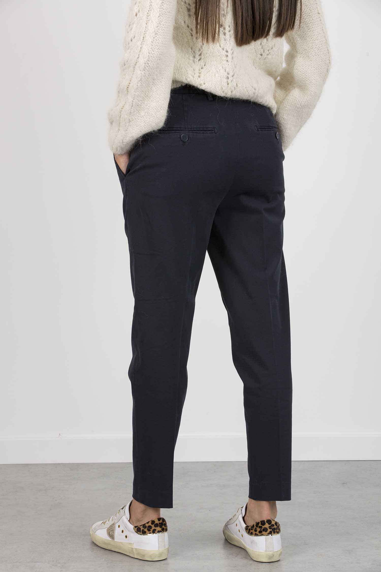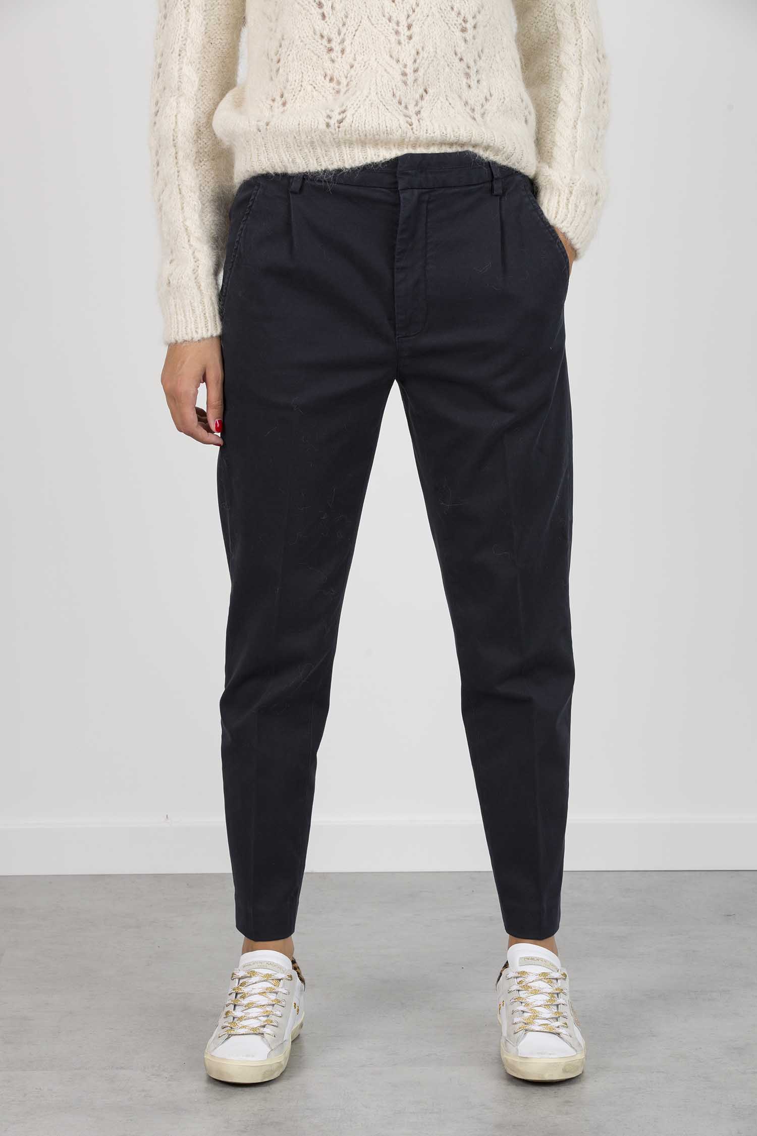 Pantalone Joy loose fit, pinces davanti, tasche a filetto posteriori e lunghezza alla caviglia. Gabardina manopesca. Tintura in capo. Logo Dondup. Made in Italy