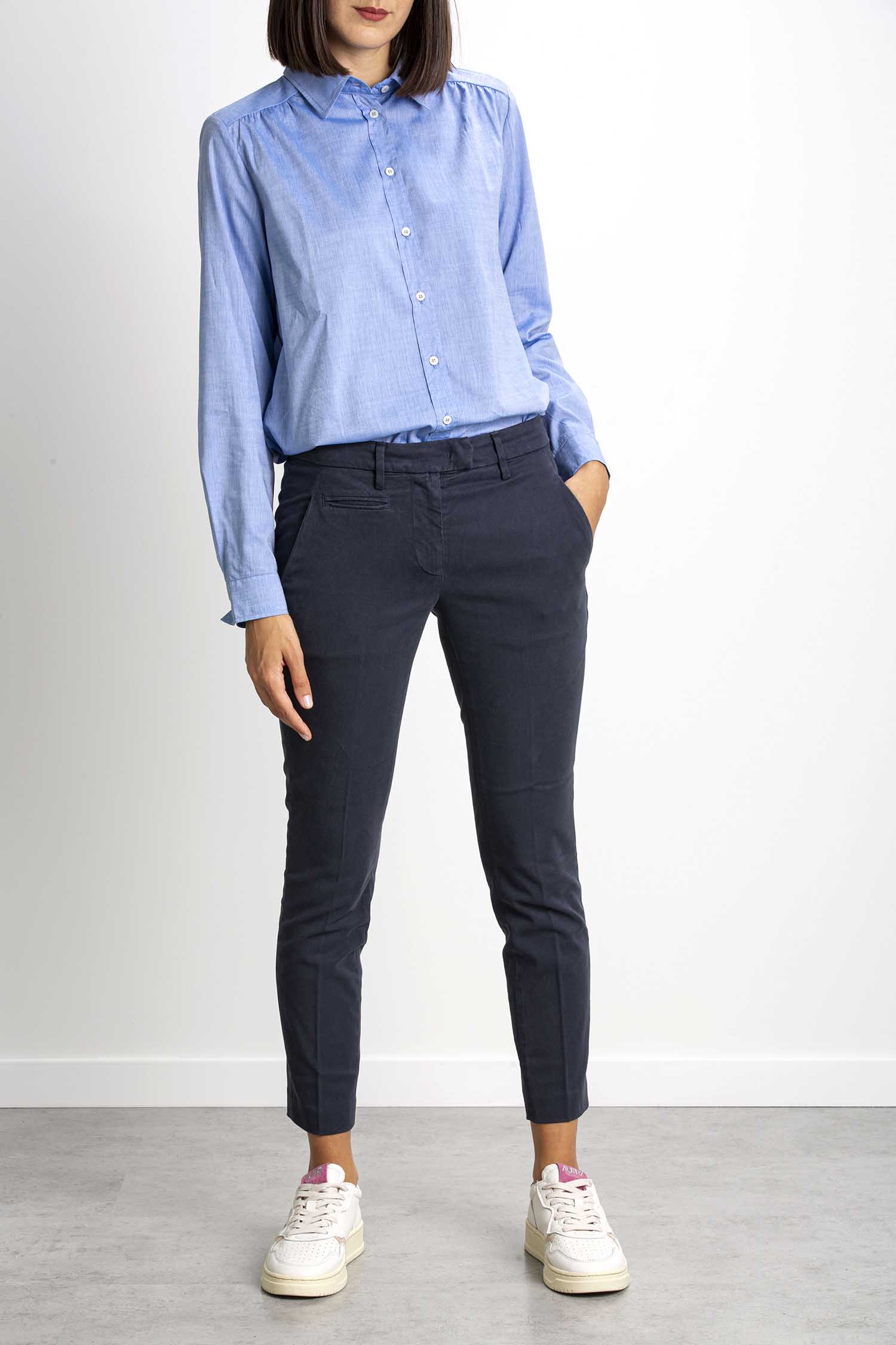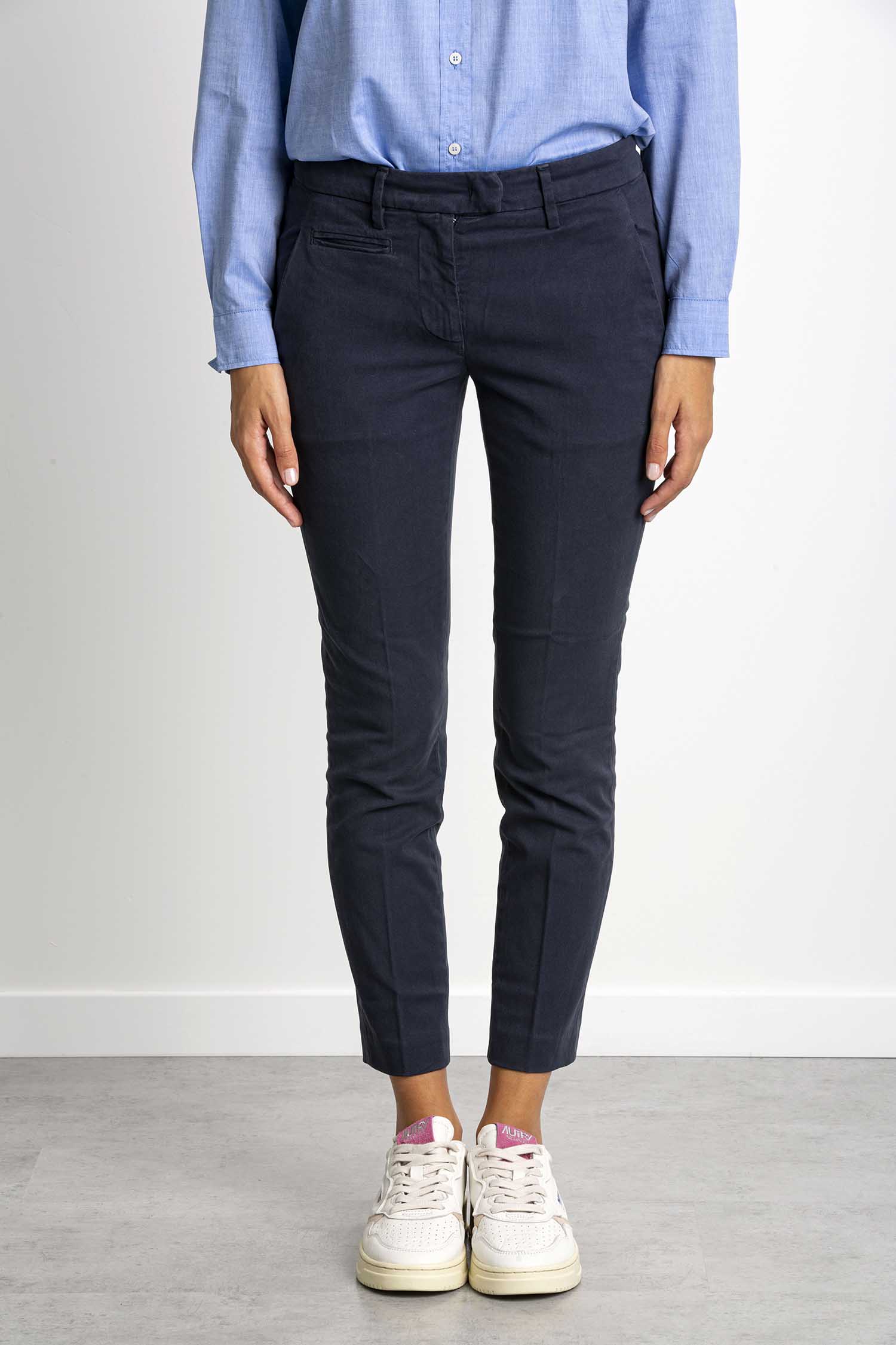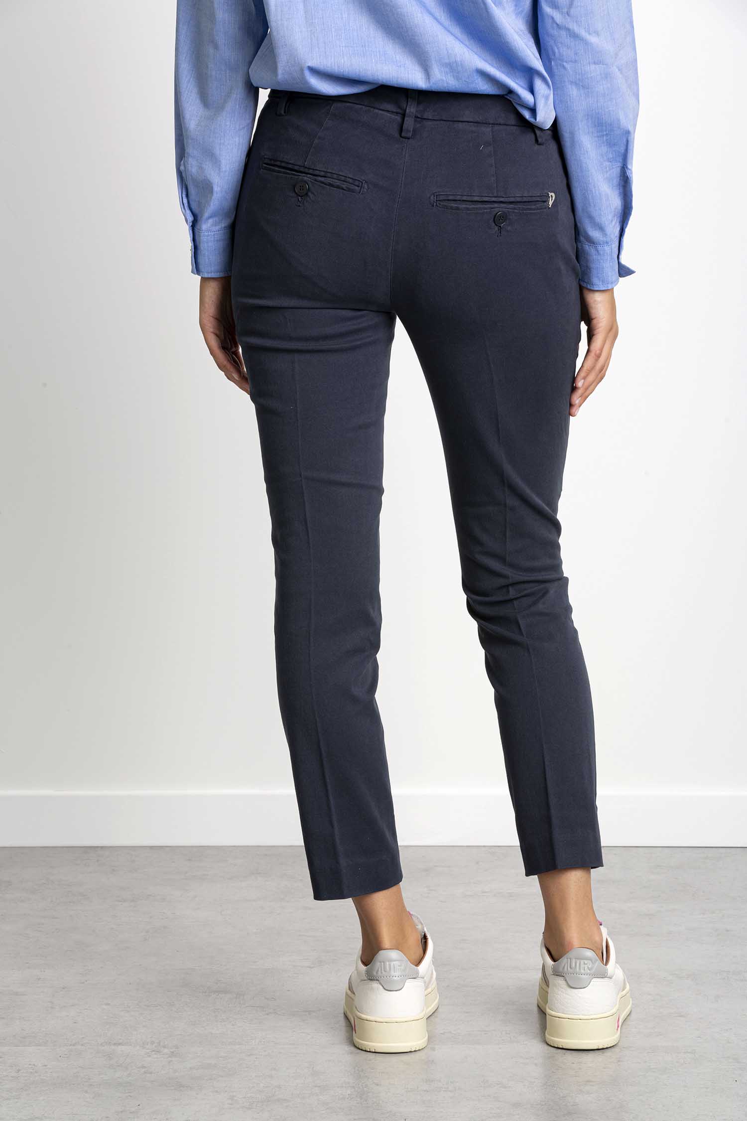 Pantalone Perfect cropped slim chino, vita regolare, tasche a filetto posteriori. Gabardina stretch mano calda. Tintura in capo. Logo Dondup. Made in Italy