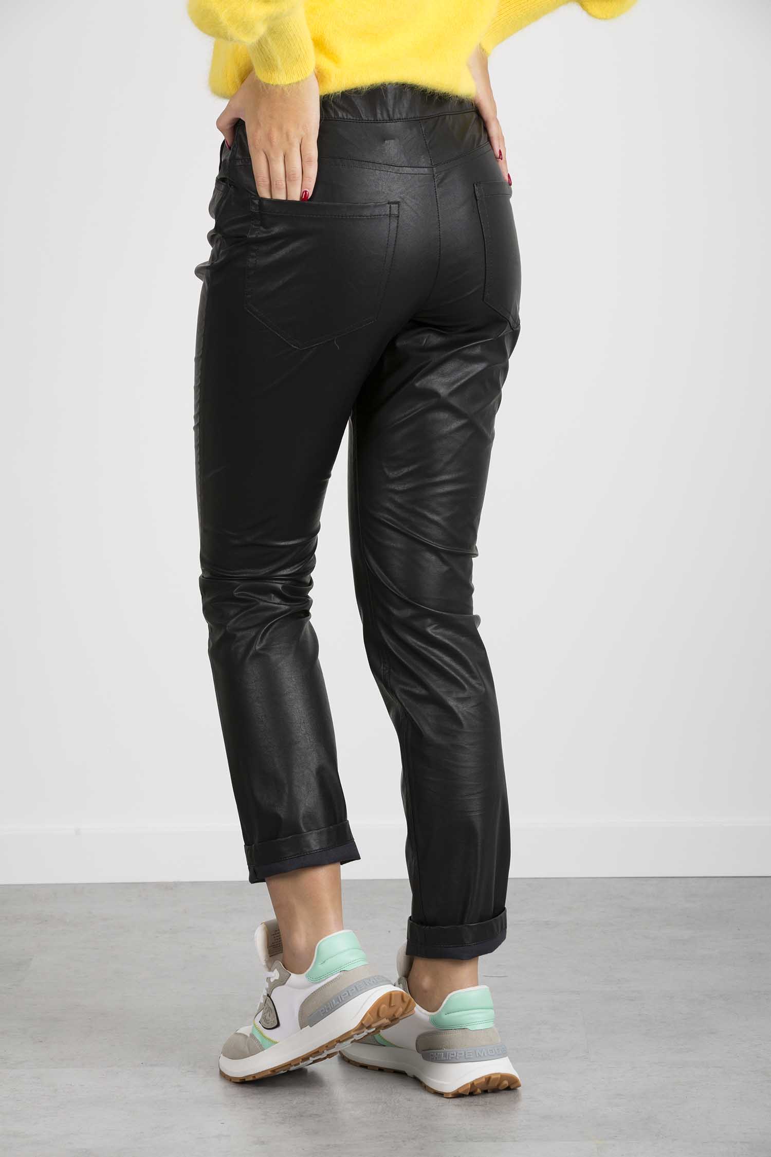 Pantaloni cinque tasche in tessuto spalmato, linea skinny. Chiusura con bottone e zip nascosta.