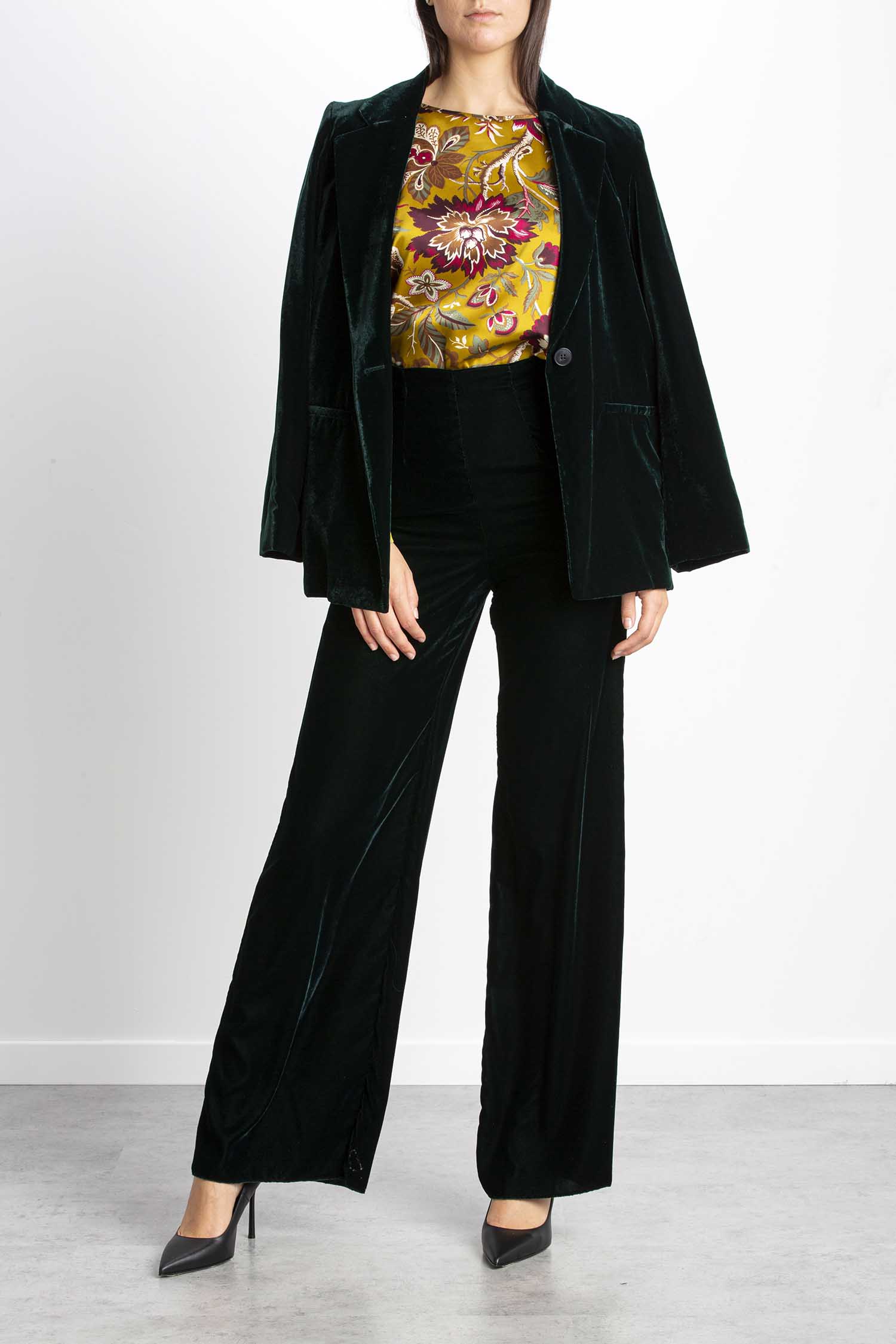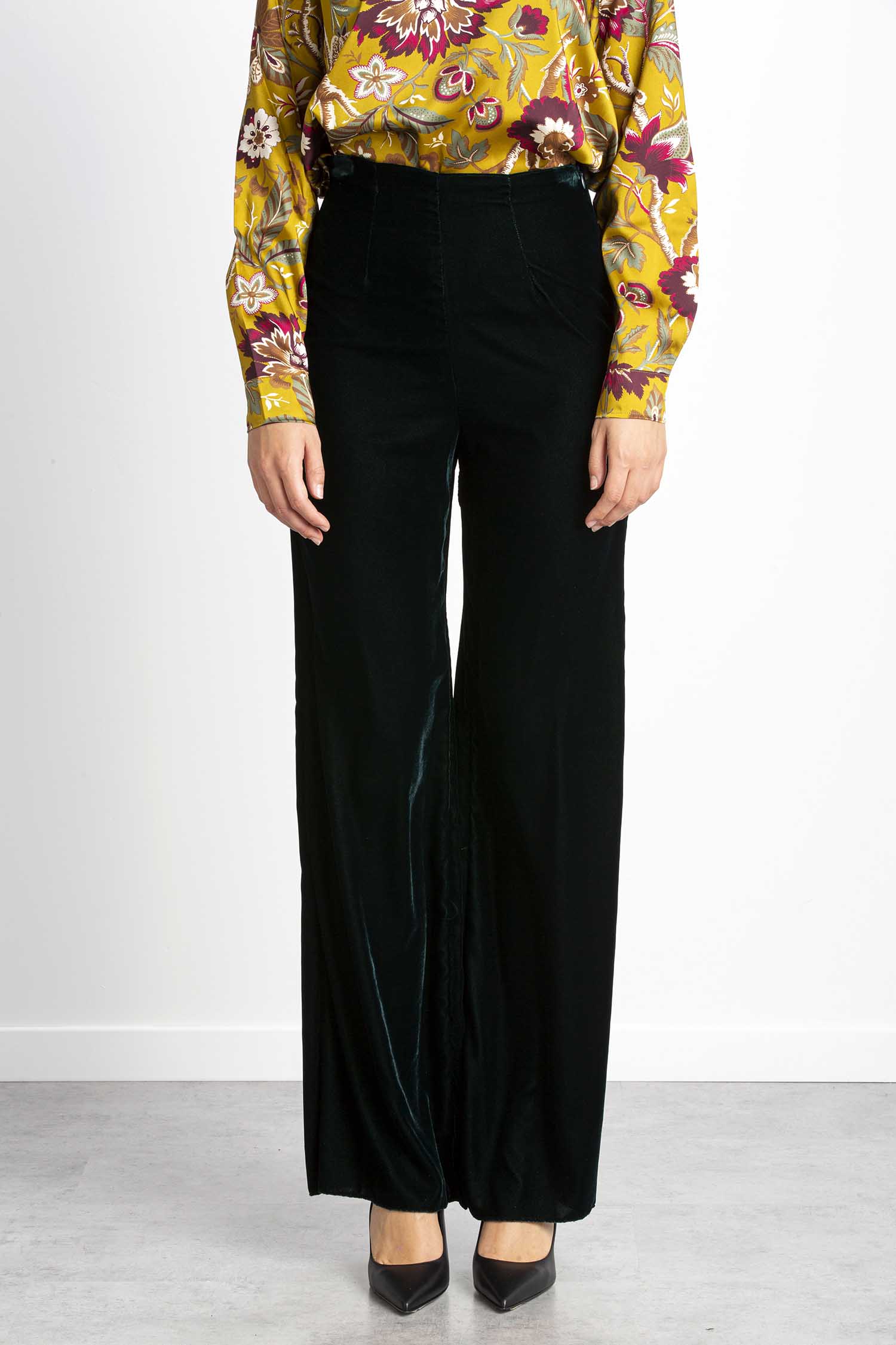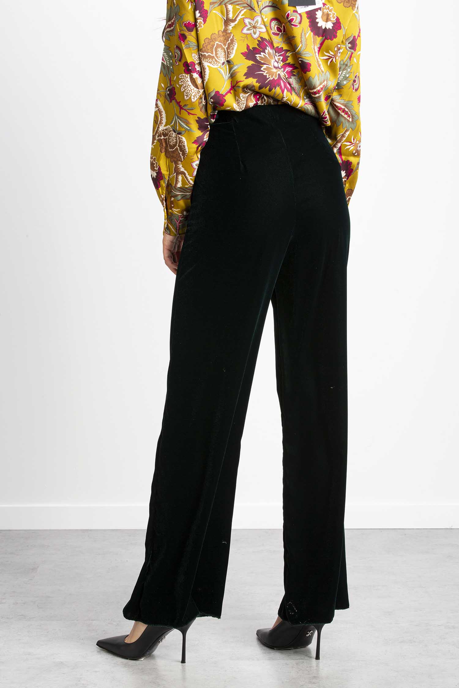 Pantaloni in velluto, linea dritta. Vita alta con pinces, chiusura con zip invisibile sul fianco.