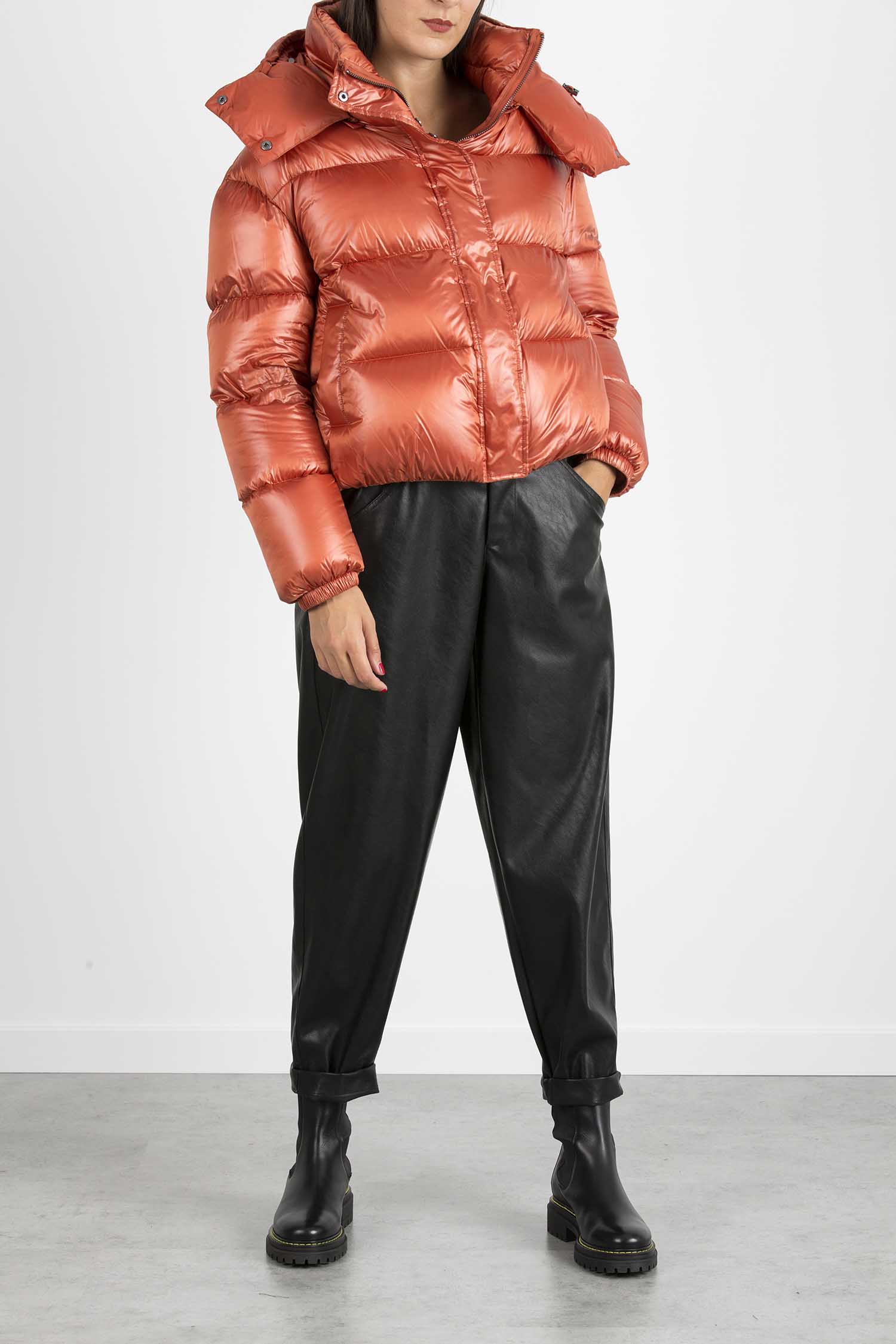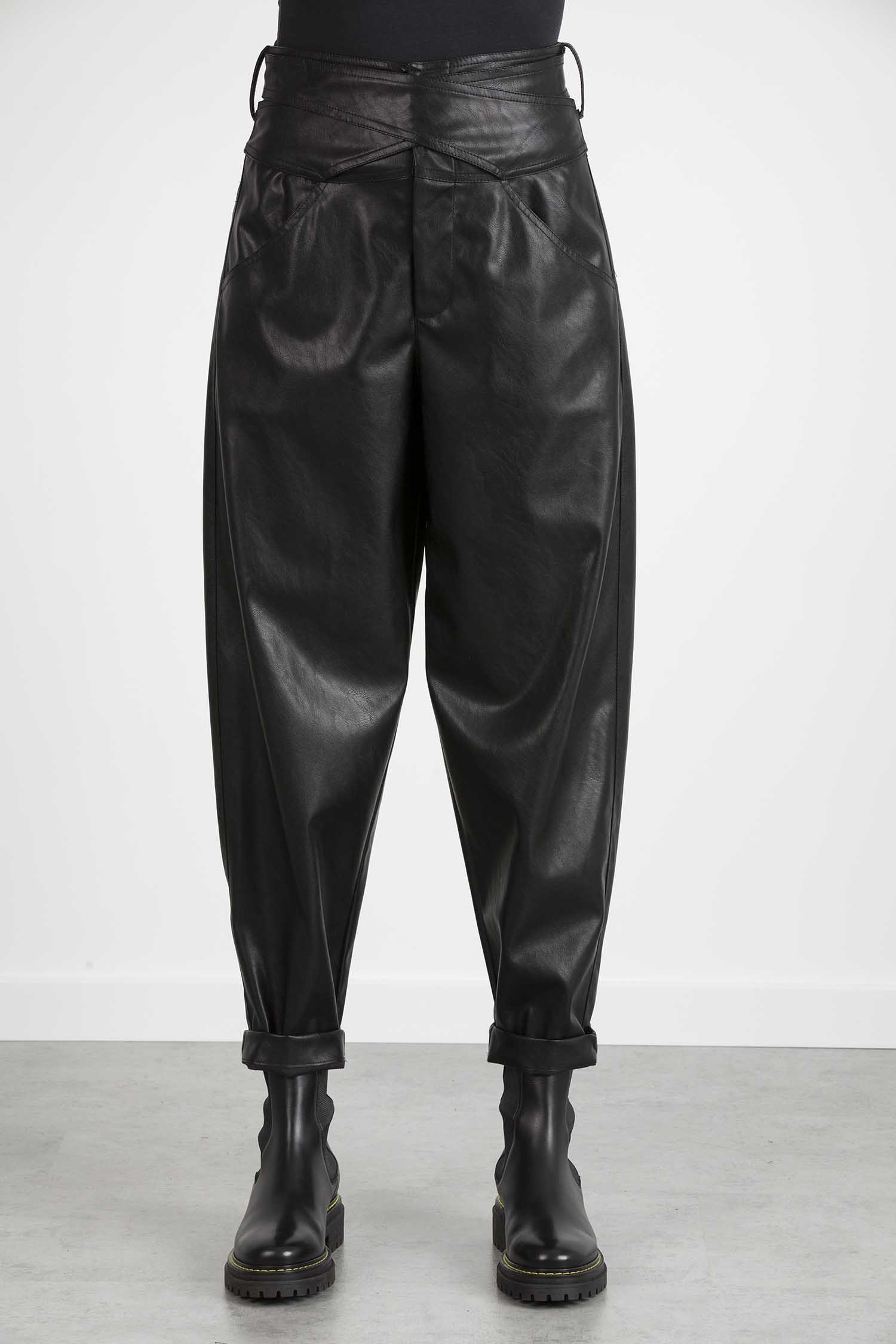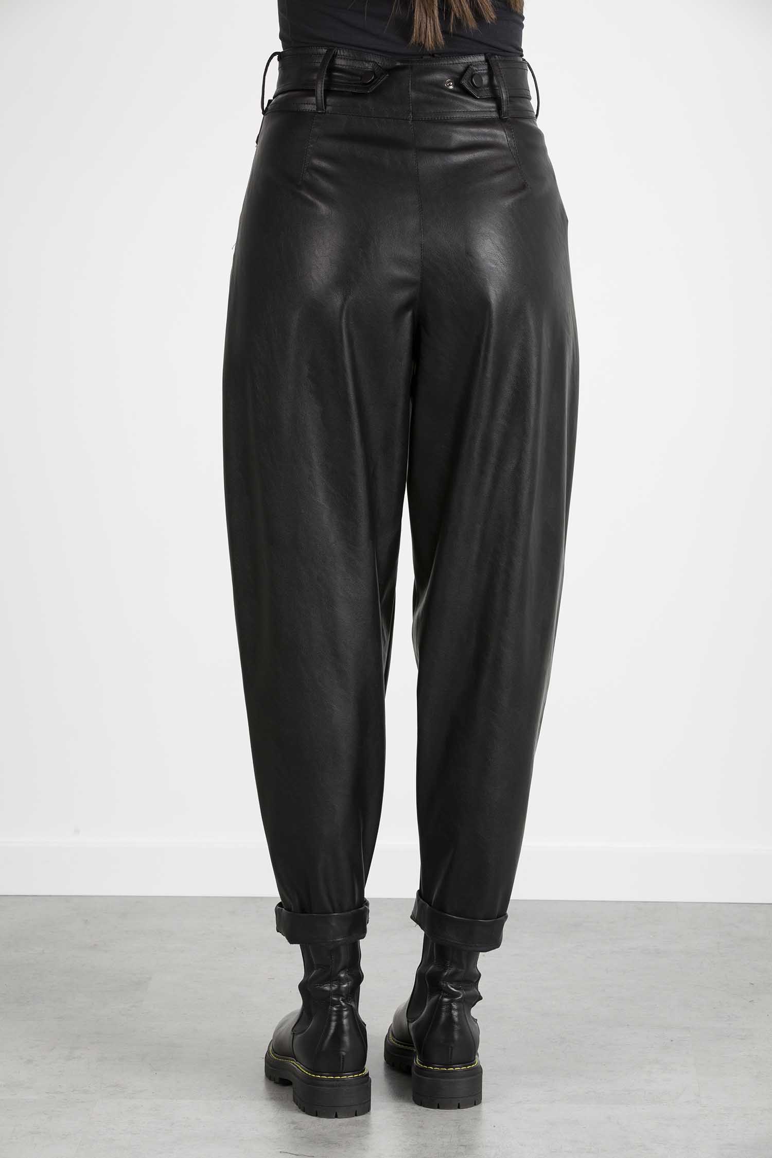 Pantaloni dalla linea slimfit in tessuto effetto pelle. Vita alta completata da cintura che si abbottona e si regola sul retro, tasche oblique davanti. Foderati. Chiusura con zip.