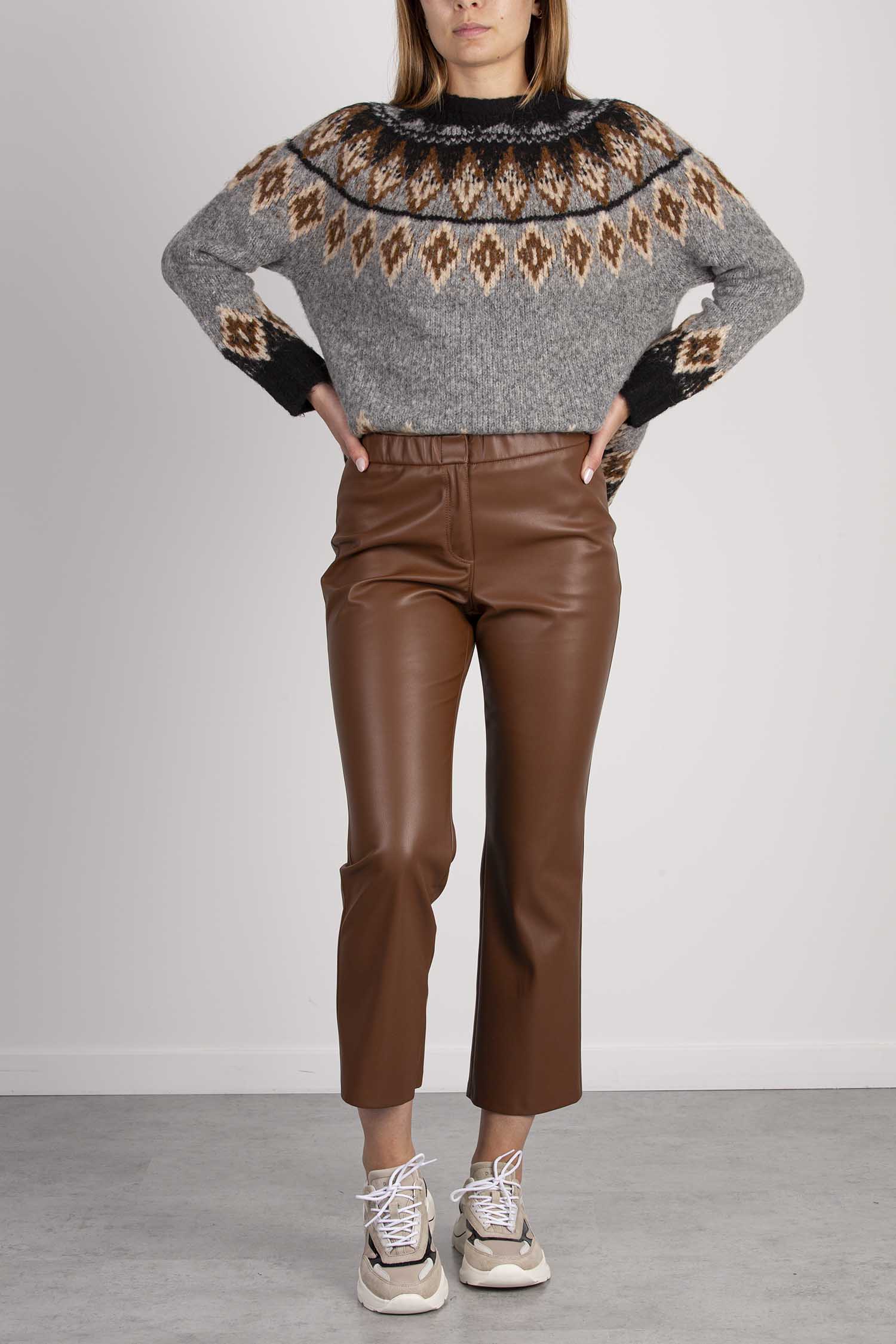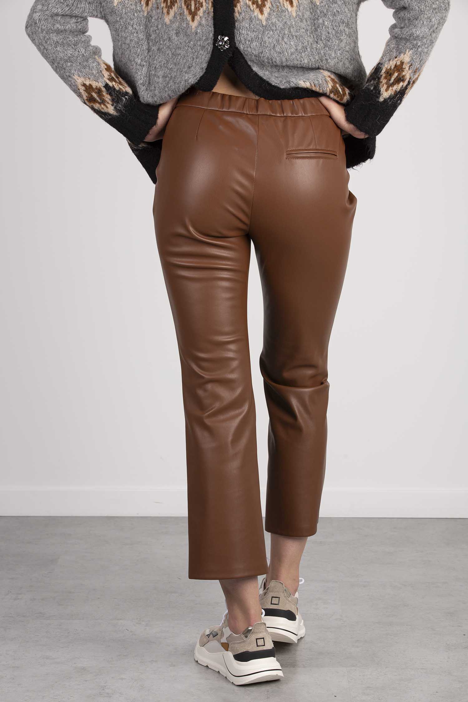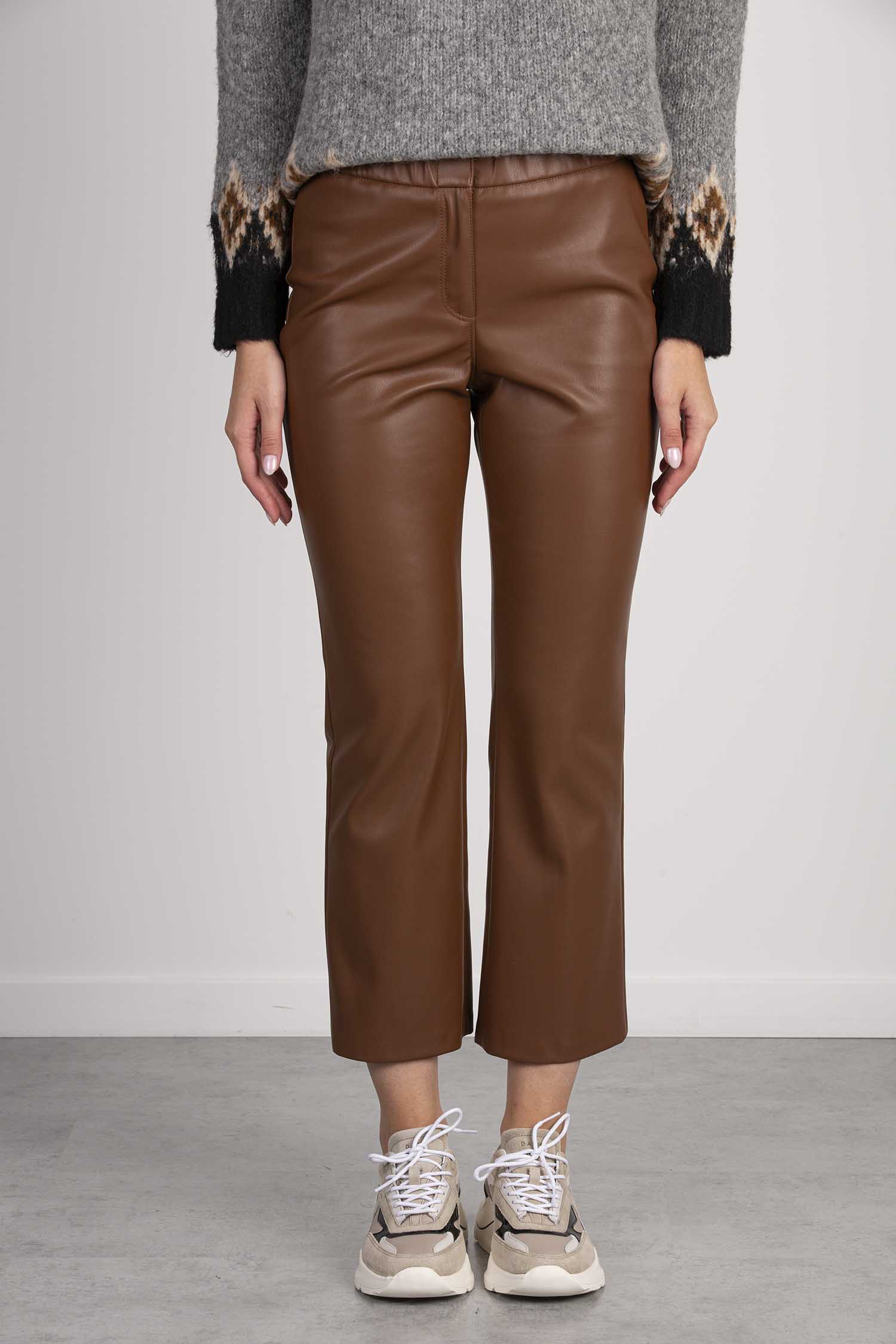 Pantalone in eco pelle, leggermente svasato sul fondo. Chiusura con gancio a uomo e zip. Vestibilità gamba regular.