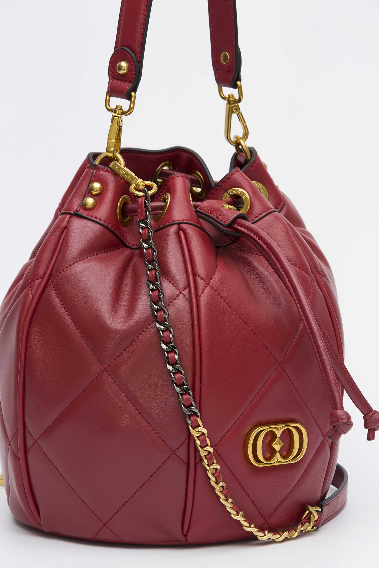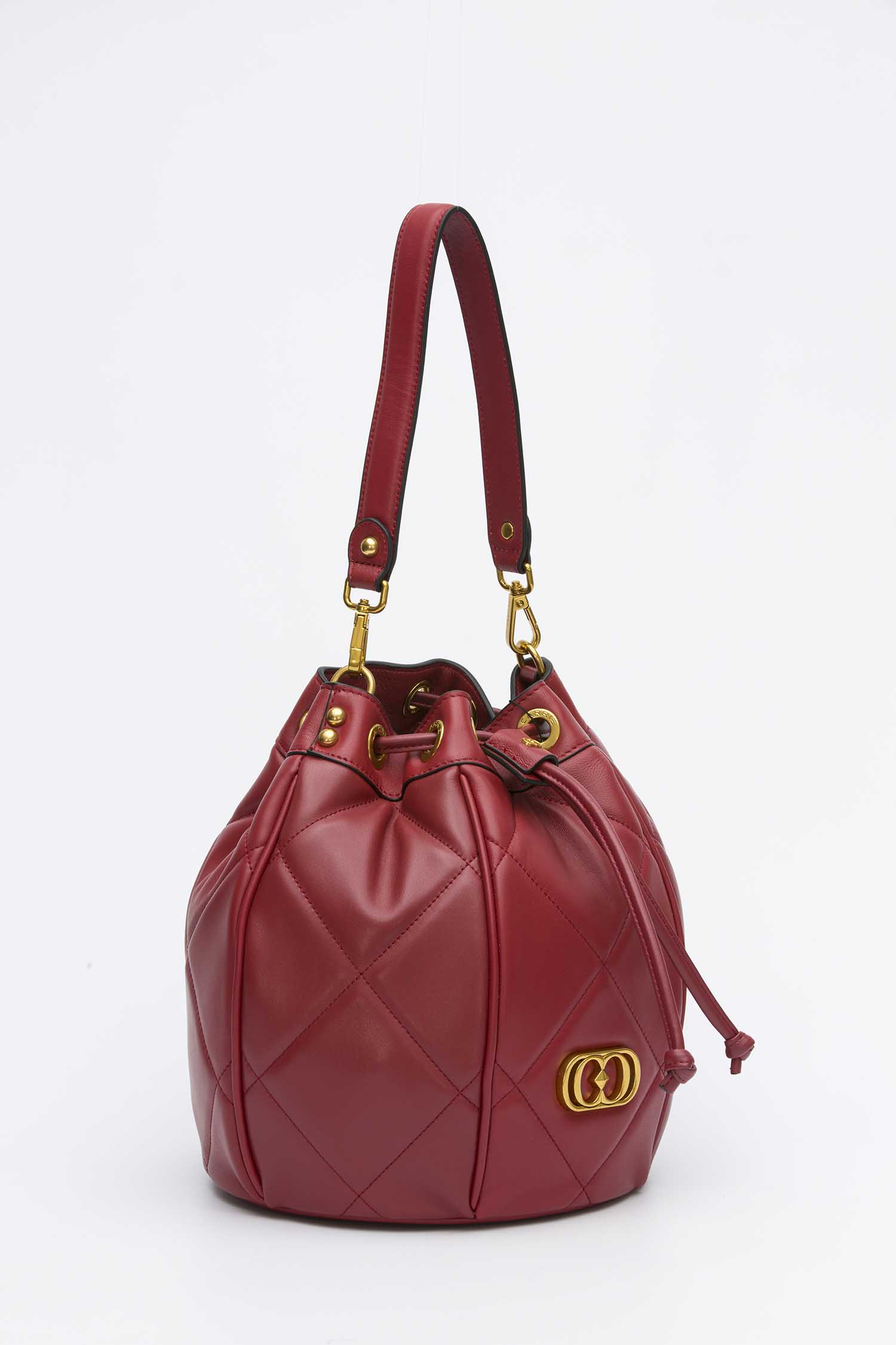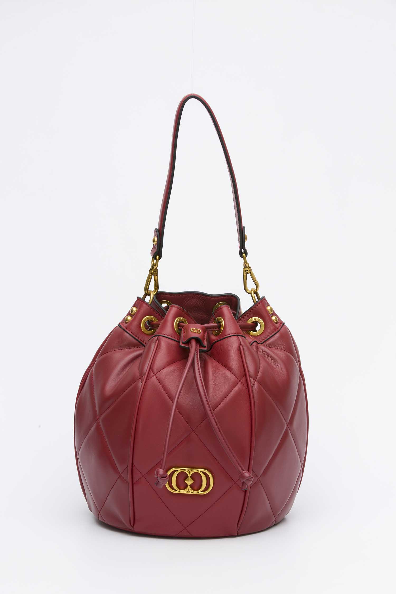 Secchiello in pelle nappata con lavorazione trapuntata e imbottita, manico di pelle e tracolla di catena.