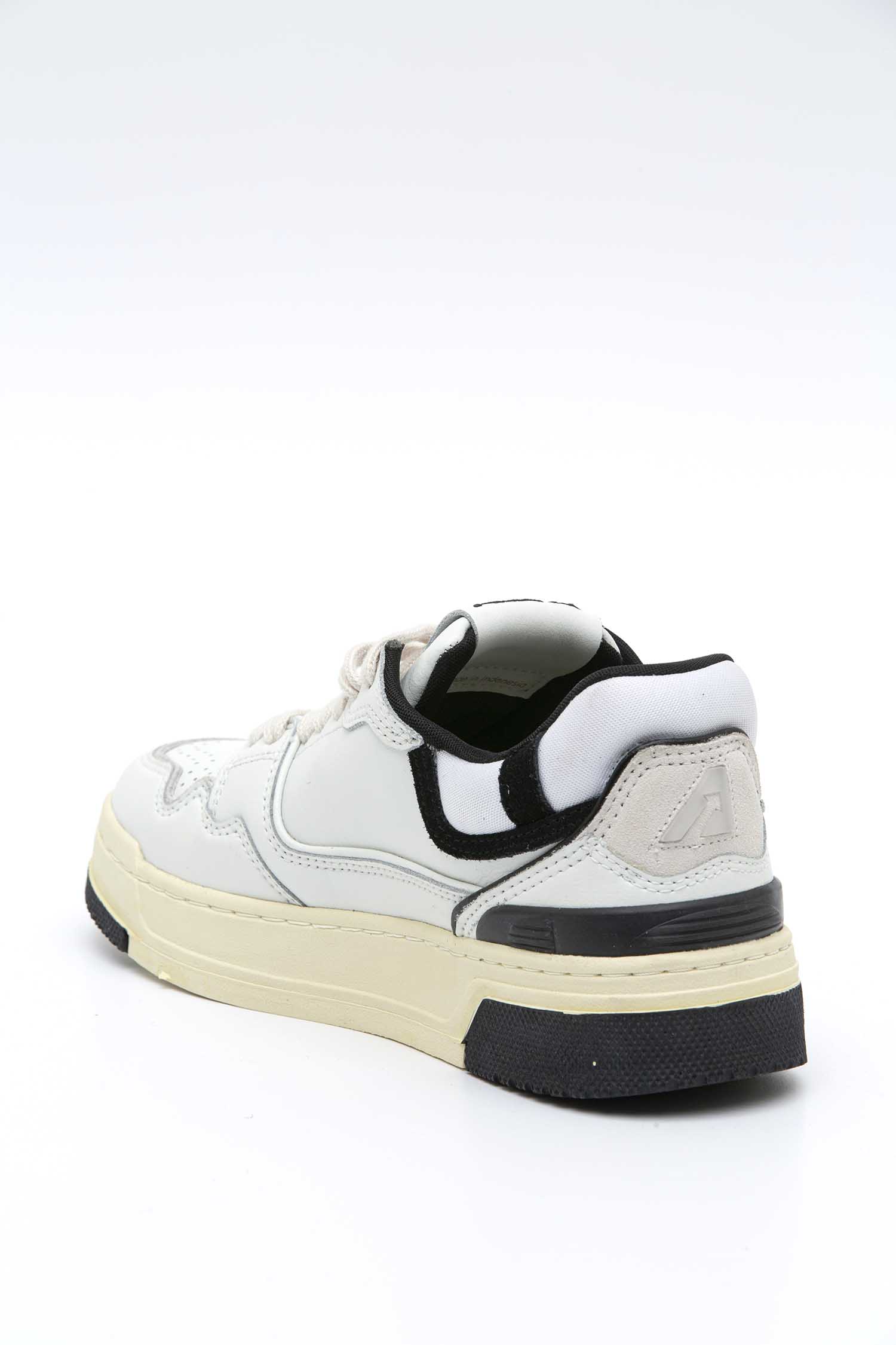 Questo modello è realizzato in pelle bianca con dettagli in suede nera, si caratterizza per la forma bold e accogliente con il colletto in mesh imbottita e la protezione interna che dà un ulteriore sostegno al tallone. Il tratto distintivo è la suola alta in gomma con il battistrada a rilievo che alterna bianco e nero ed enfatizza l’energia street del design.