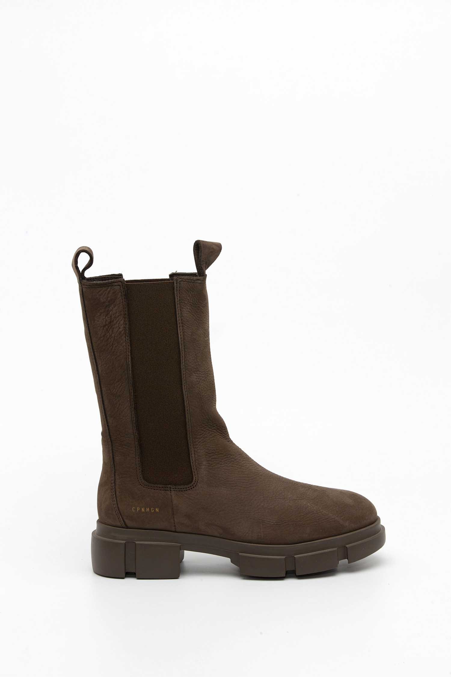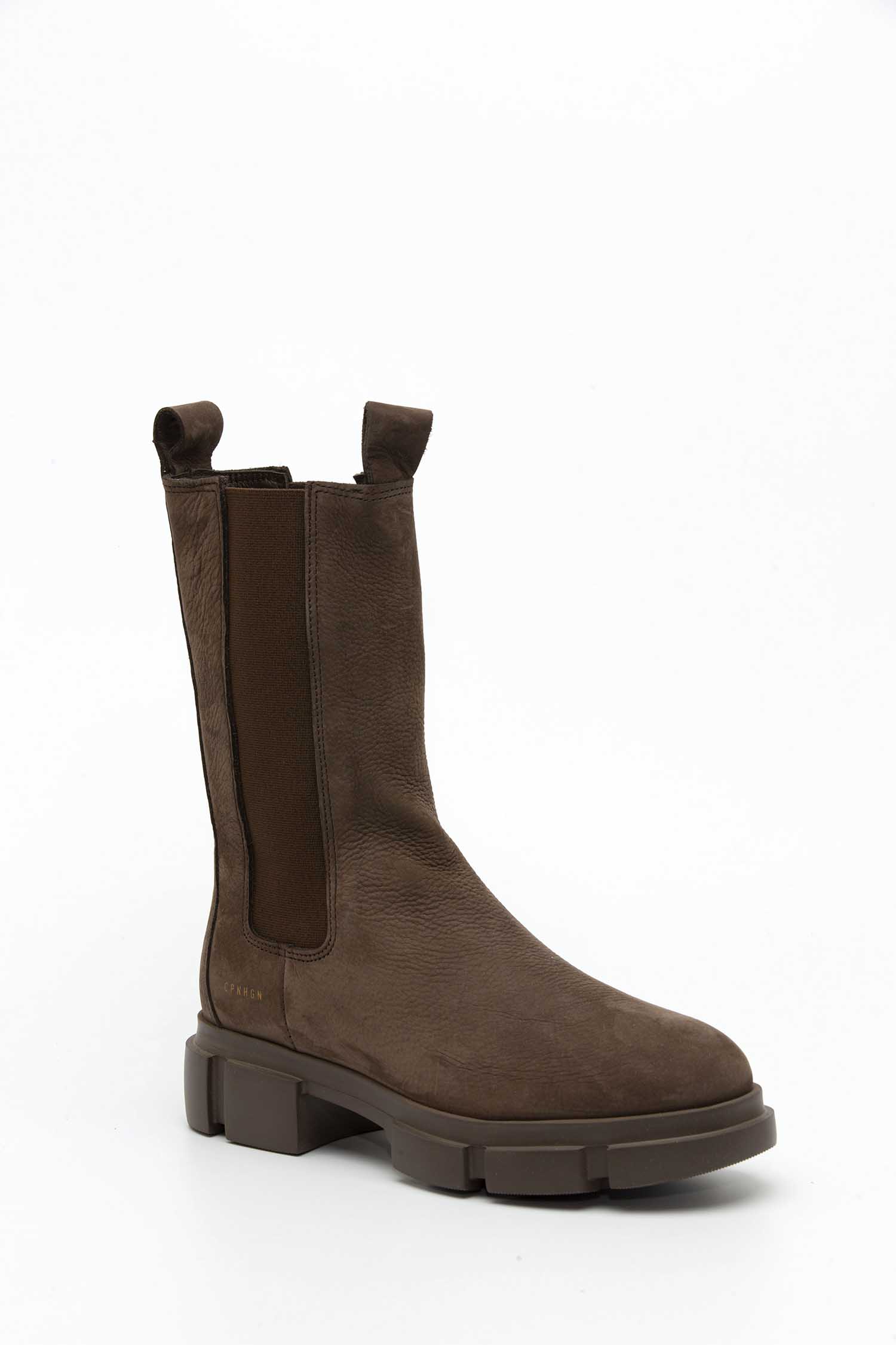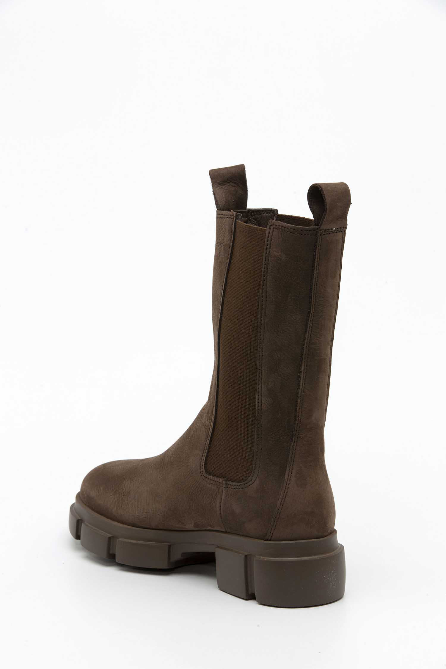 Stivaletti Chelsea di media altezza realizzati in morbida pelle nabuk. Silhouette Chelsea allungata. berretto tondo. Inserti elastici. Due anelli di trazione sull’albero. Logo color oro all’esterno.