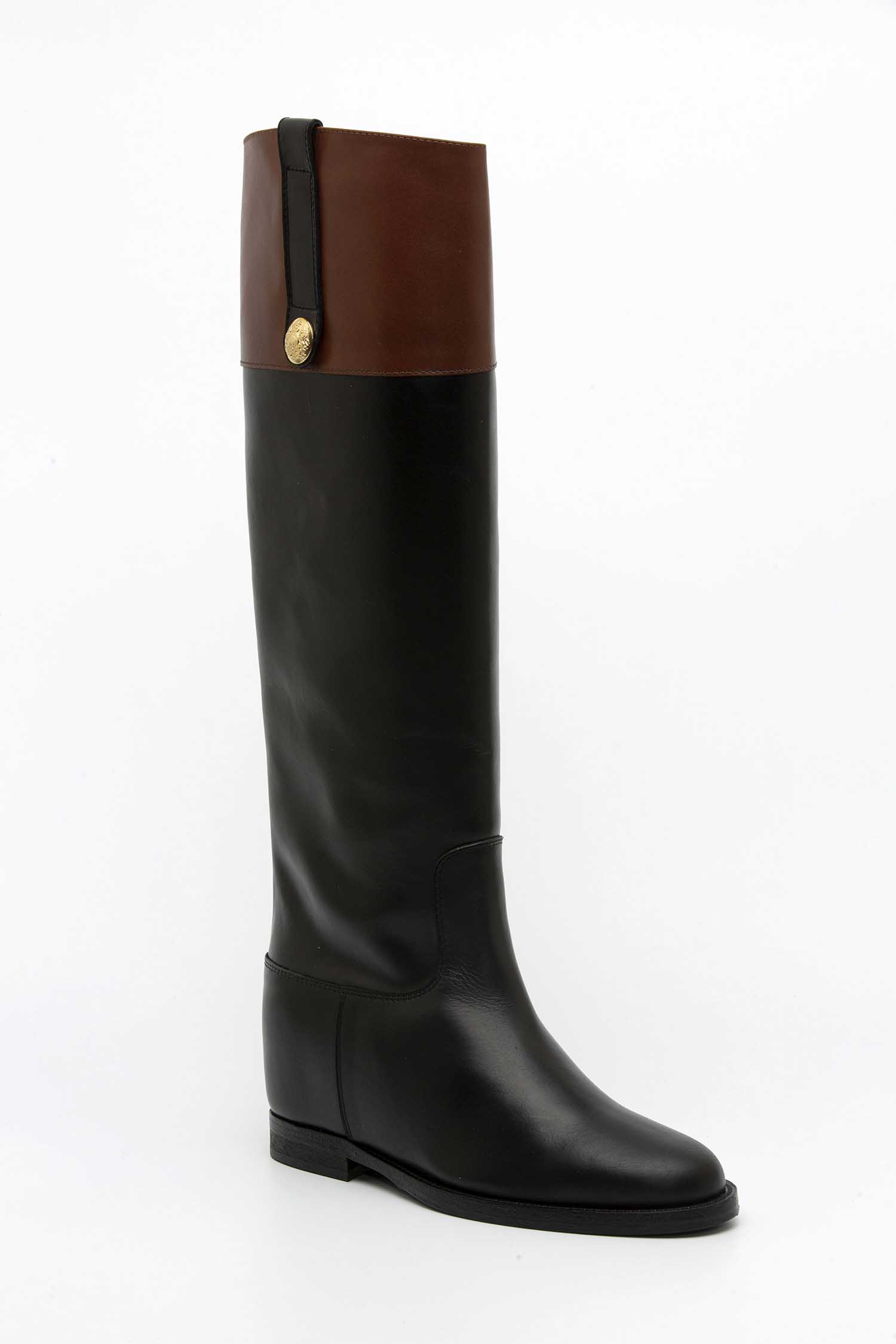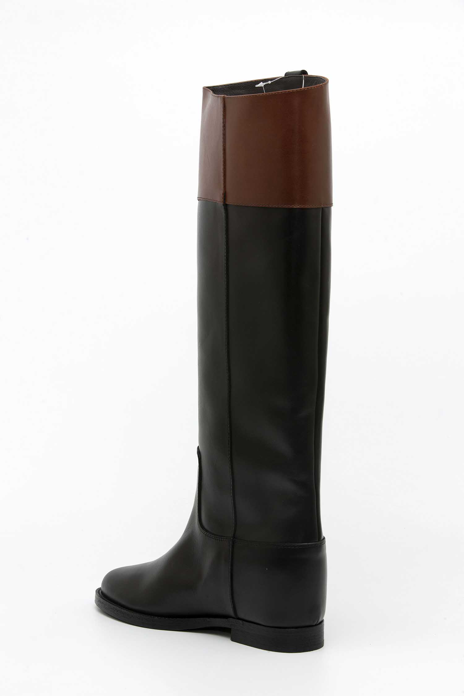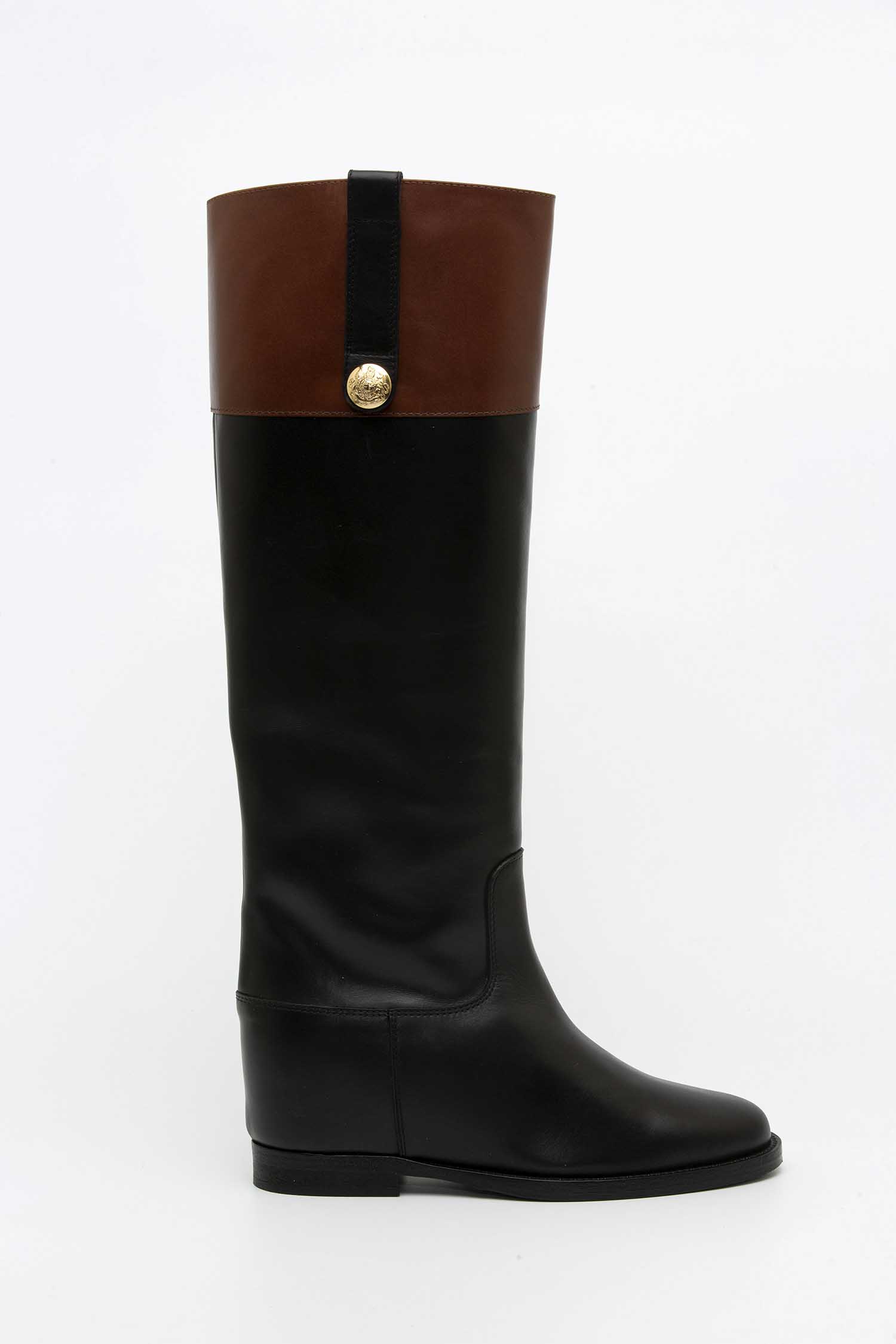 Stivale alto in pelle nera, con banda color cuoio sulla parte alta del gambale.
