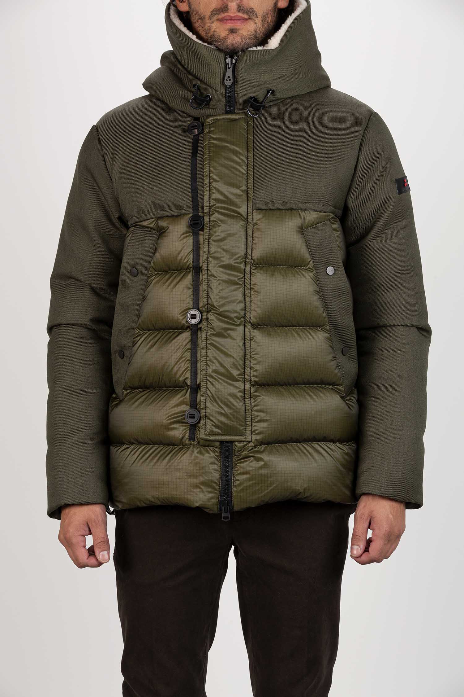Giacca in doppio materiale: nella parte superiore e sulle maniche troviamo drill di lana e nylon cordura dalla particolare raffinatezza e resistenza; nella parte inferiore nylon ripstop sette denari super fine e dall’aspetto lucido con imbottitura a canali.