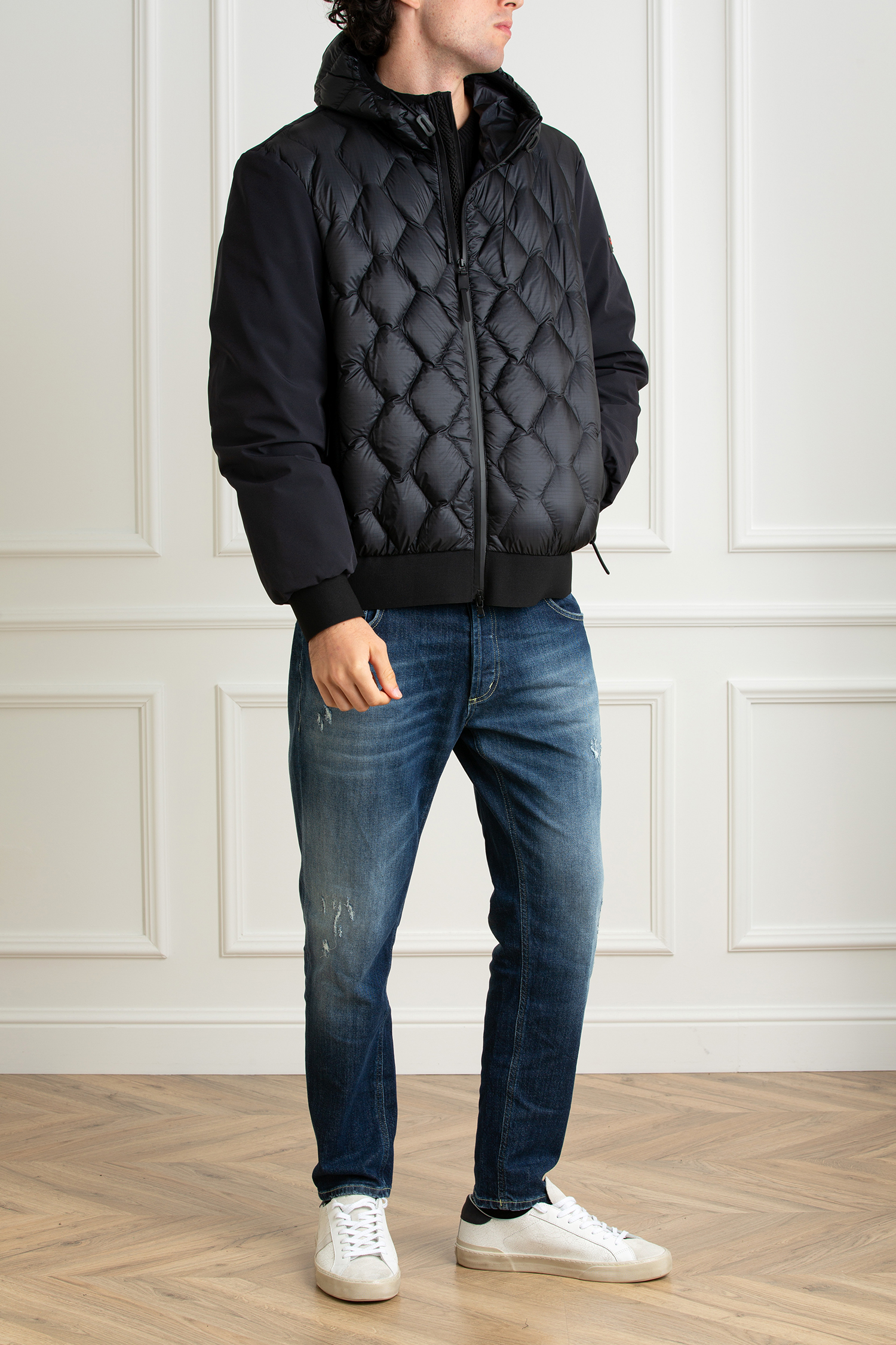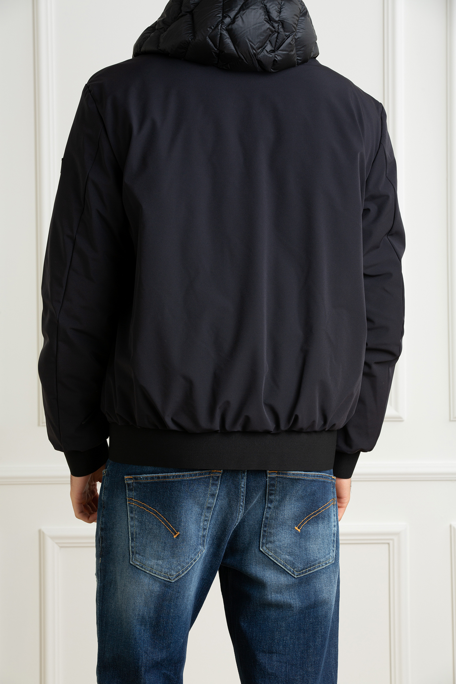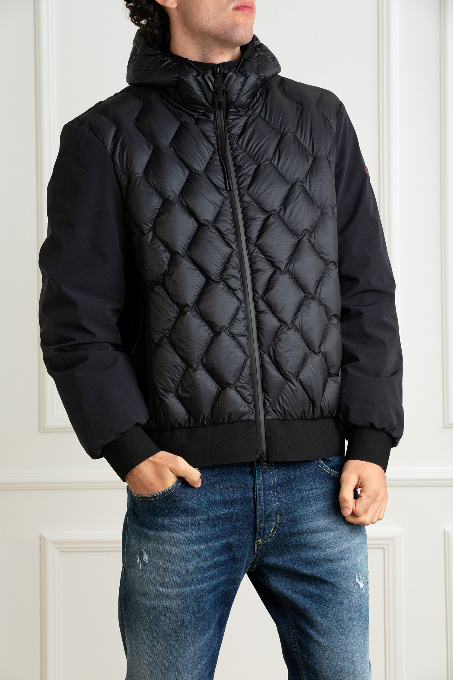 Bomber composto da due materiali tecnici: nylon ripstop 7den, superleggero e lucido e una tela di nylon stretch accoppiata con un jersey di nylon soffice e caldo, che garantisce appeal tecnico e una vestibilità ultra confortevole. Il design originale mostra un fronte capo con trapunta geometrica a rombi mentre maniche e retro sono lisce. Polsini e fondo in maglina nera elastica. Ne nasce un capo altamente di tendenza, adatto a chi non ama passare inosservato. I dettagli stilistici ed estetici confermano l’anima urban di questo capospalla che si caratterizza per: full zip centrale con doppio cursore, cappuccio fisso regolabile, imbottitura in piuma naturale certificata, due ampie tasche laterali con zip termosaldate. Downproof e idrorepellente.