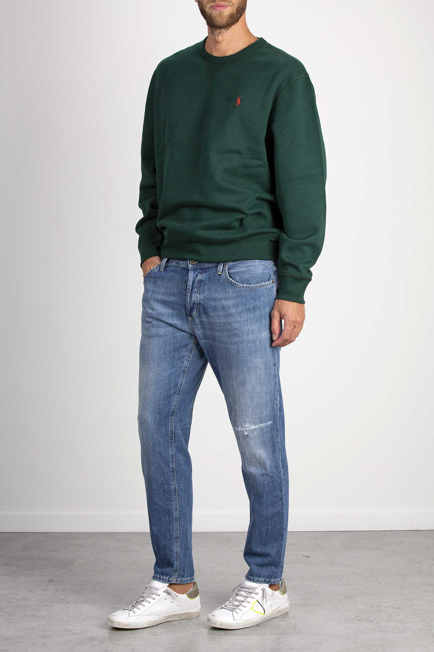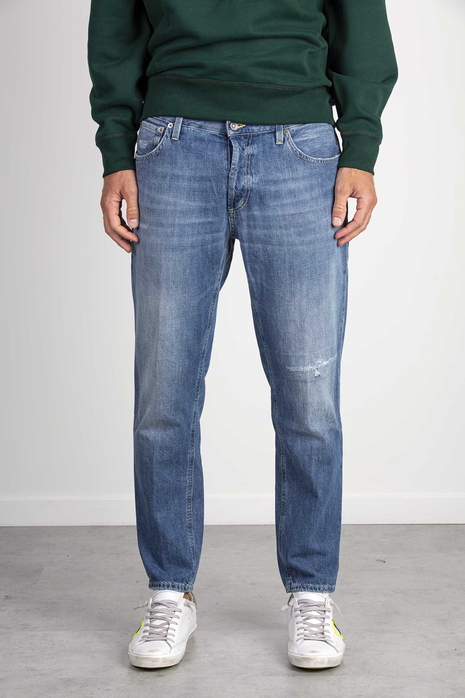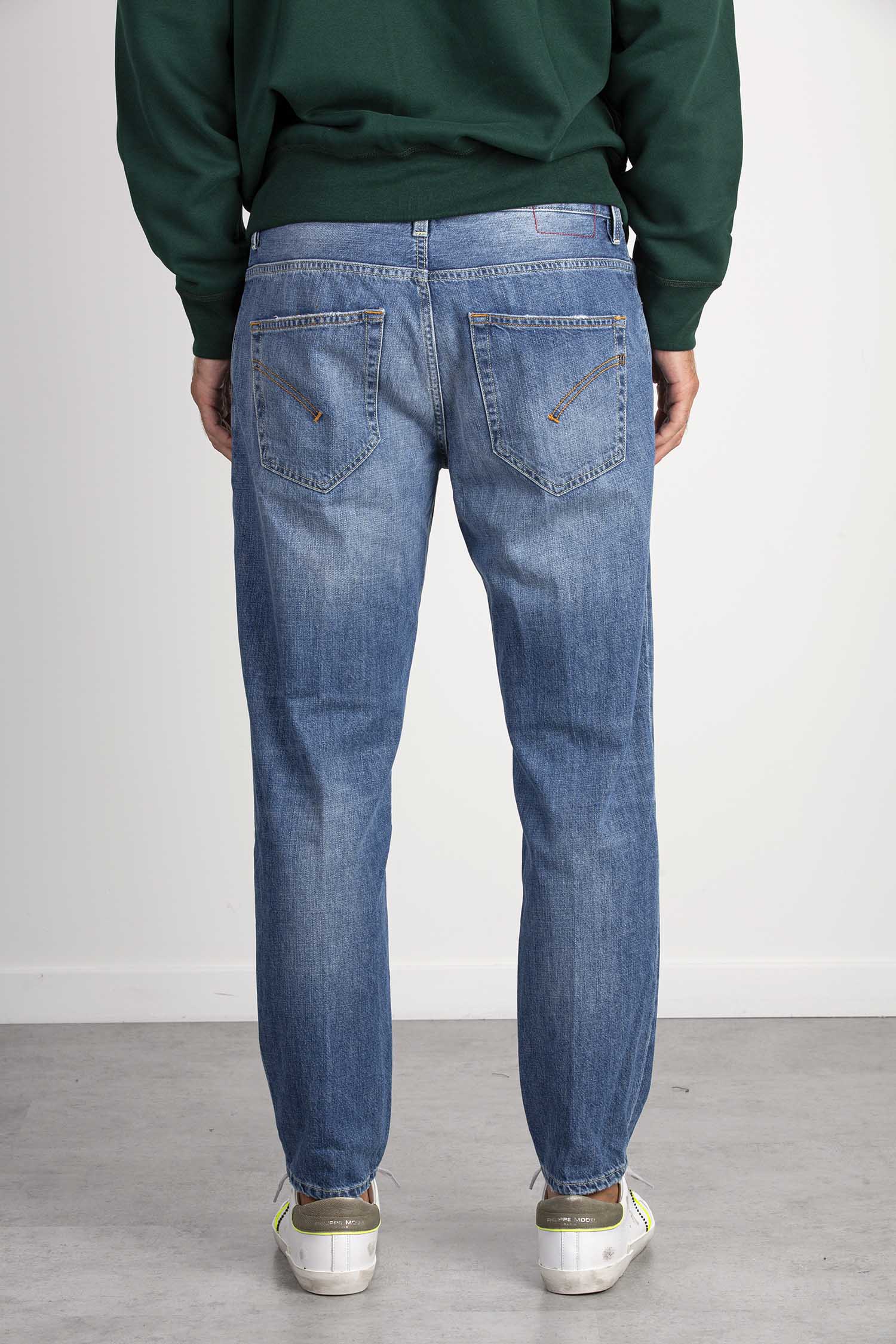 Jeans Brighton cinque tasche carrot fit, vita bassa. Denim fisso. Lavaggio vintage rammendato. Logo Dondup. Made in Italy