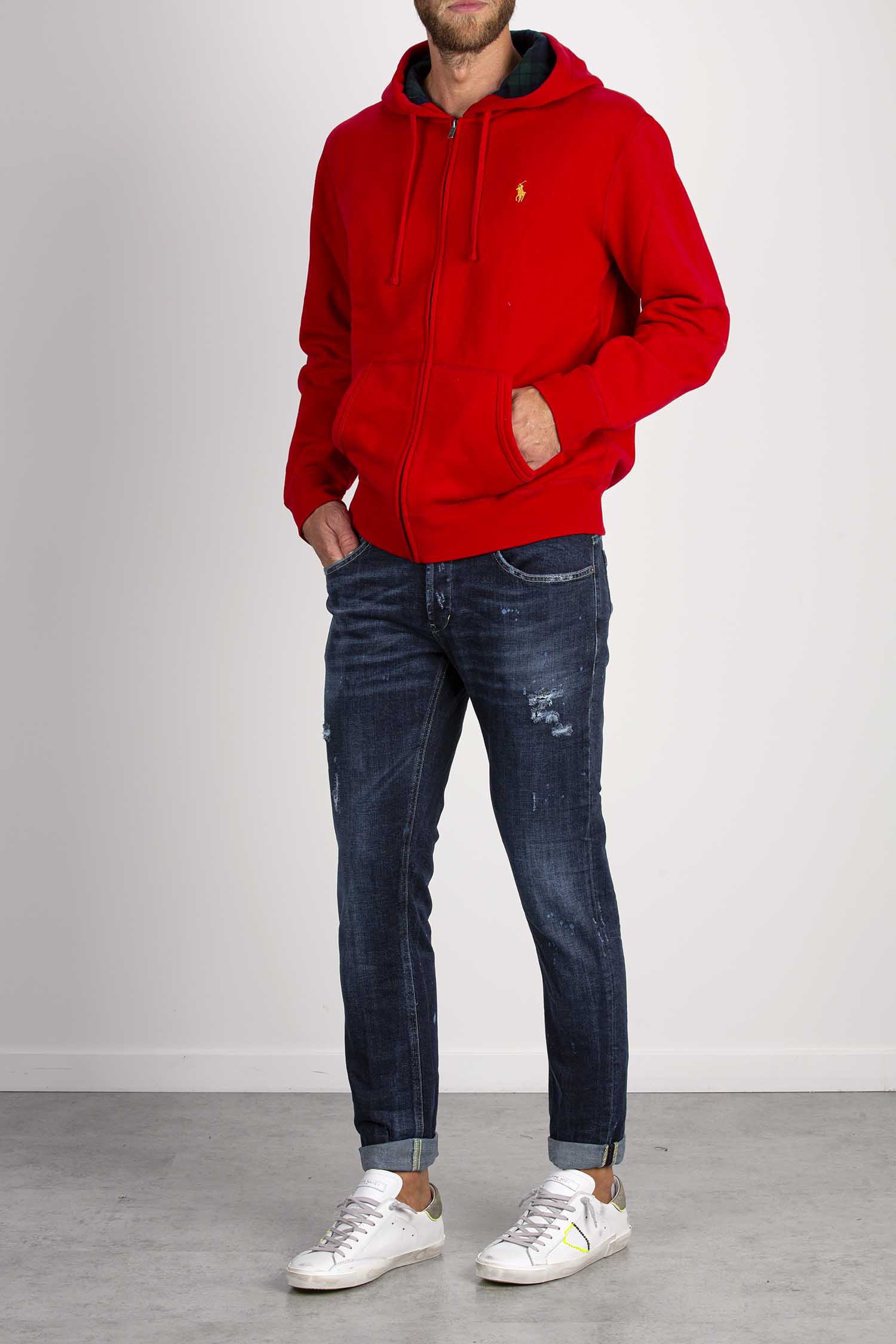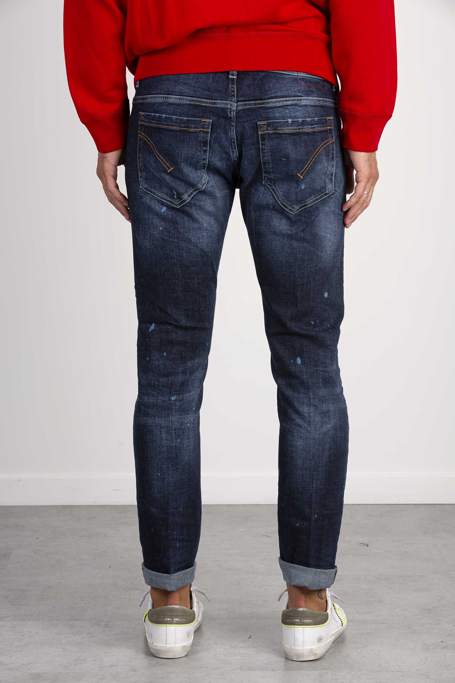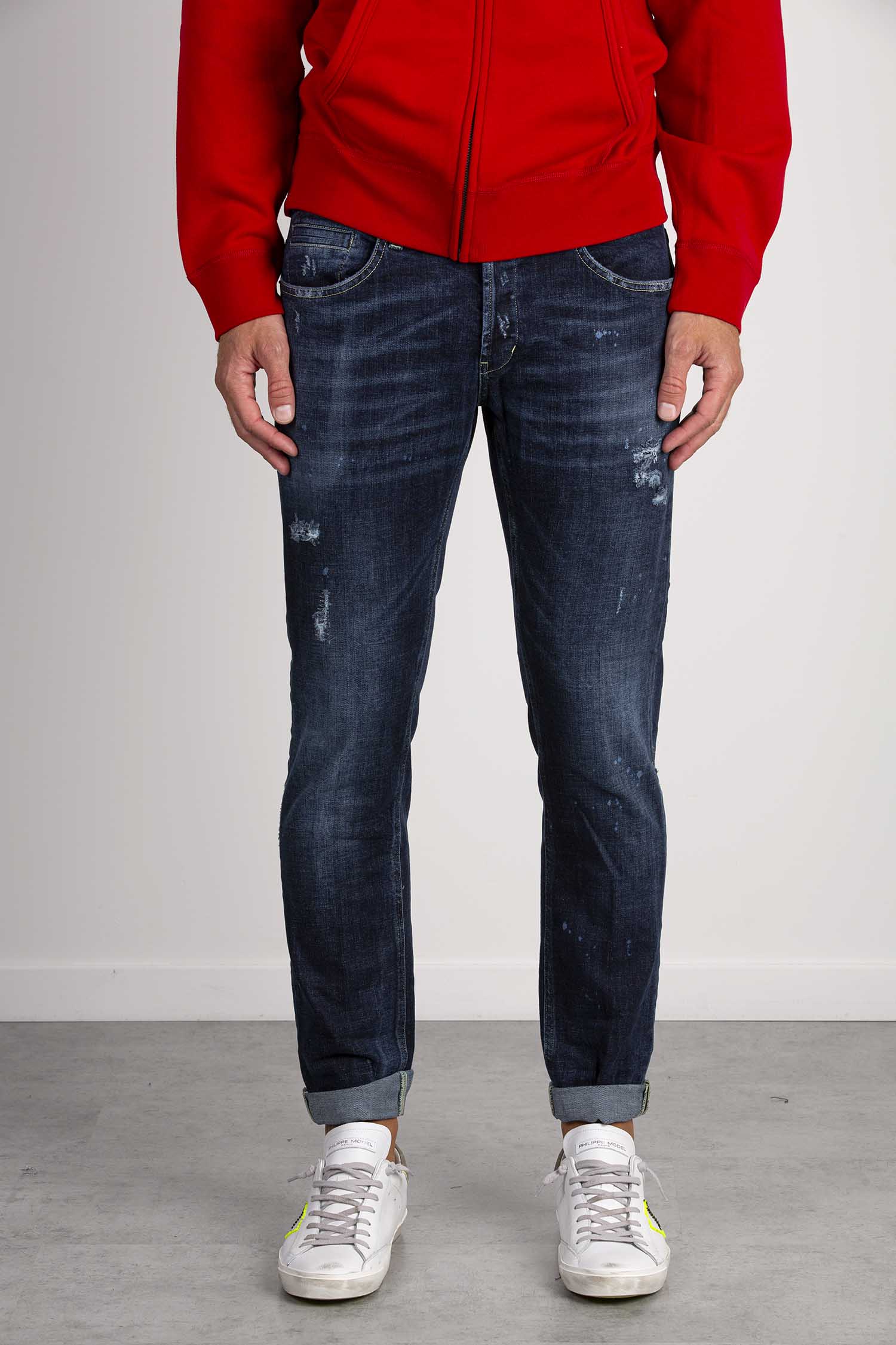 Jeans George cinque tasche skinny fit, vita bassa, taschino a filetto. Denim stretch organico blu 13 1/4 oz. Lavaggio scuro con rammendi e macchie. Logo Dondup. Made in Italy