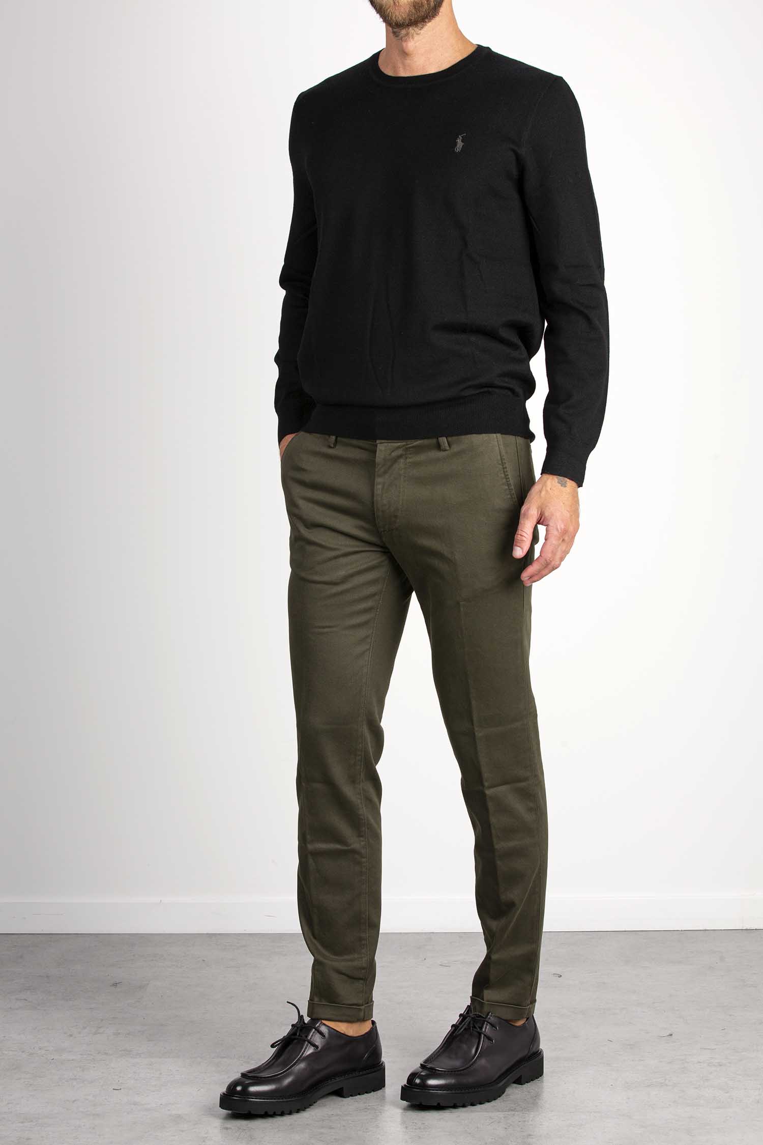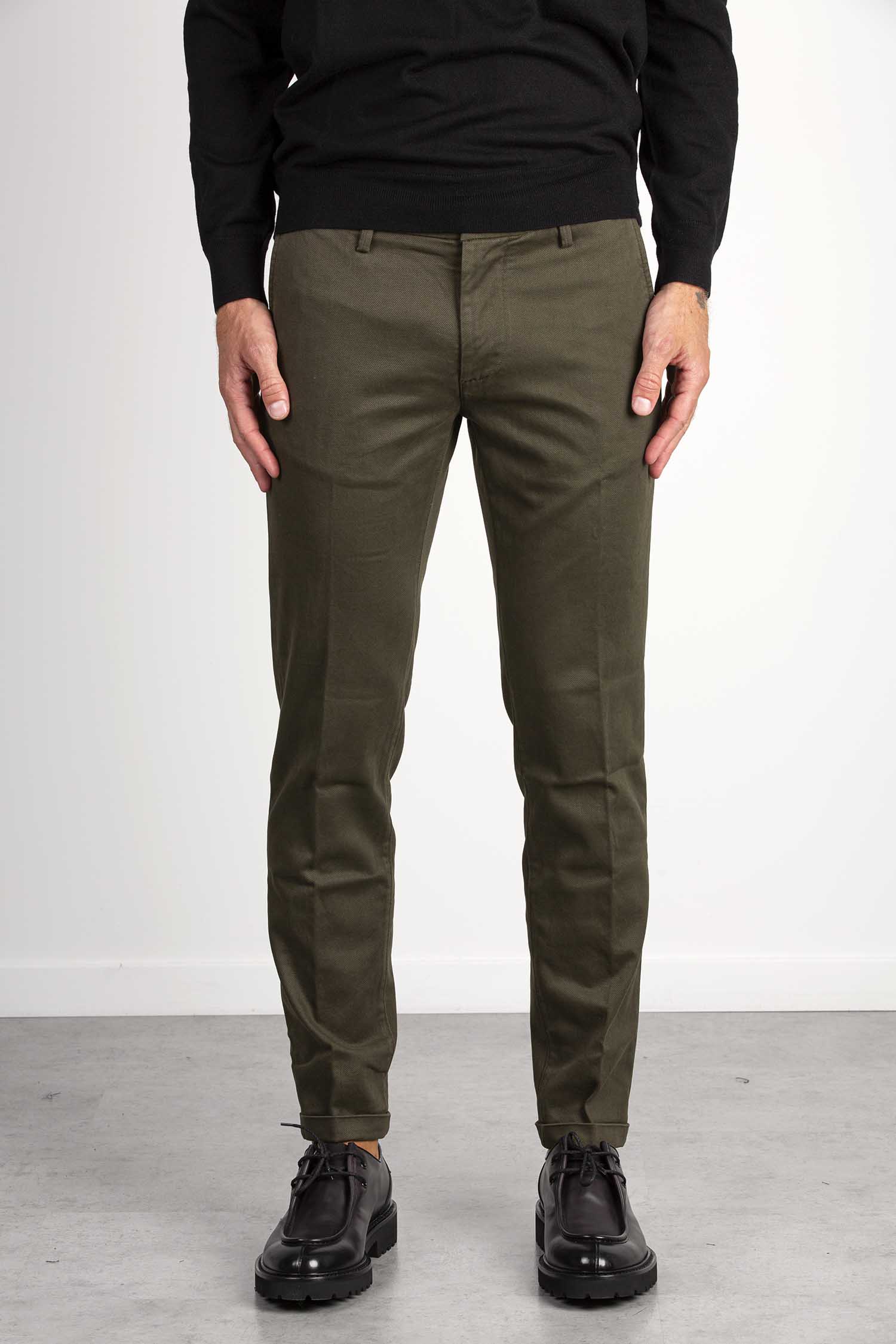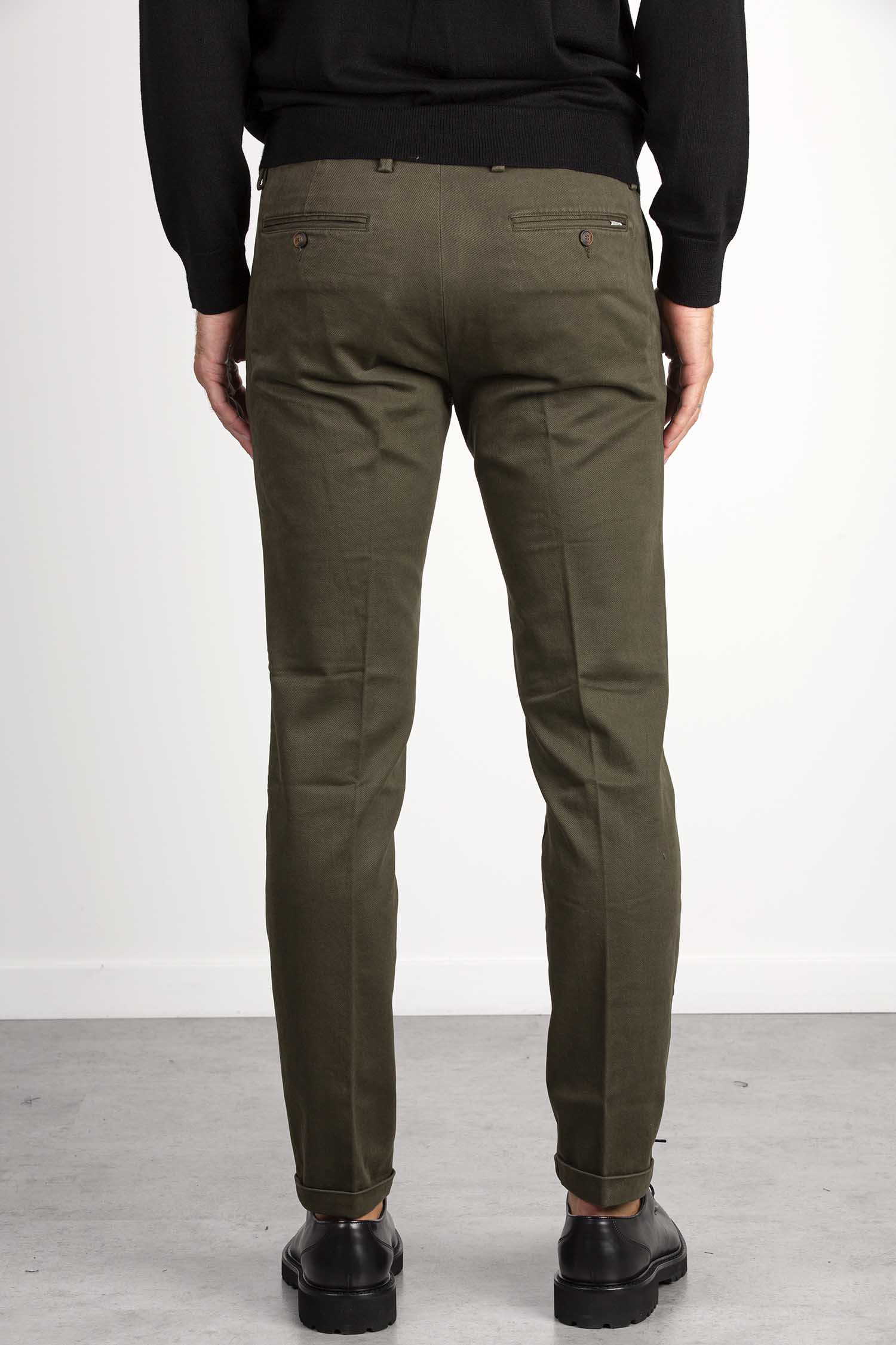 Dettaglio risvolto da 2,5 cm basso gamba e taschino porta orologio su lato davanti destro indossato.
