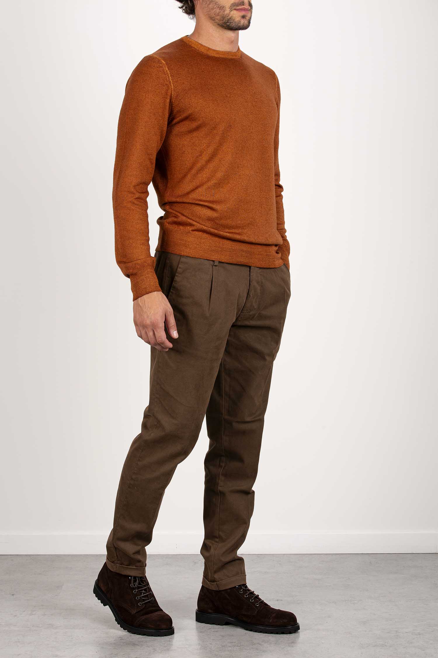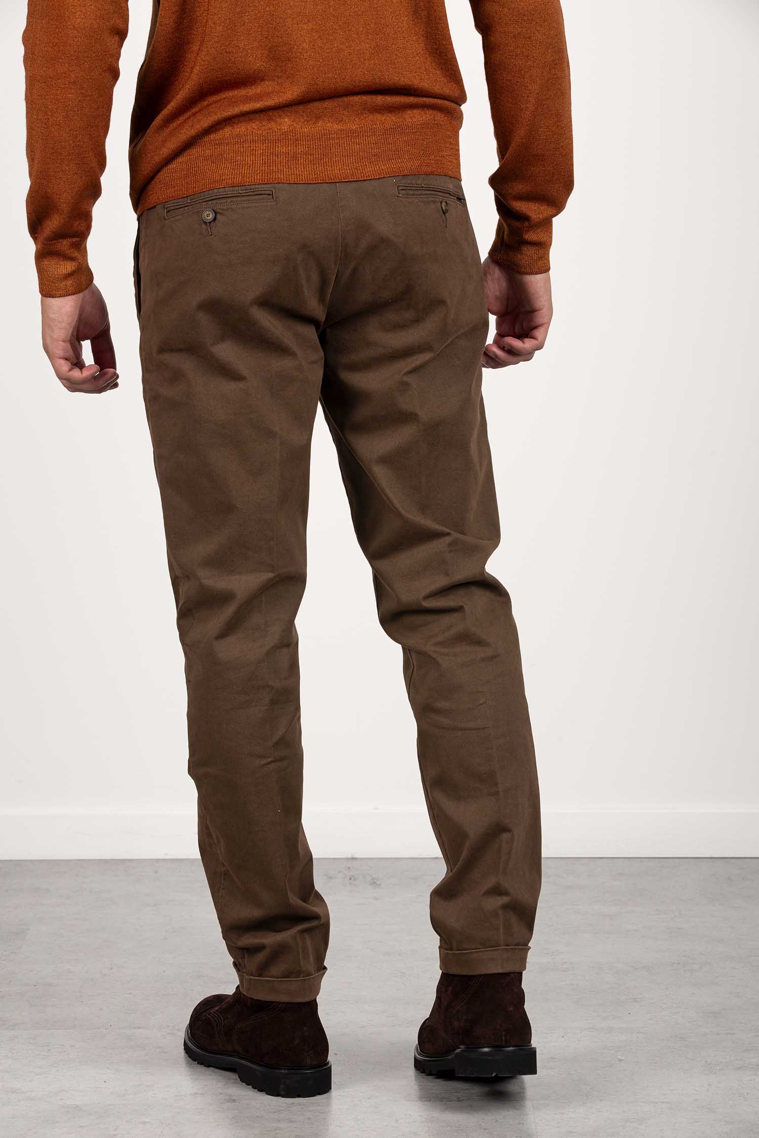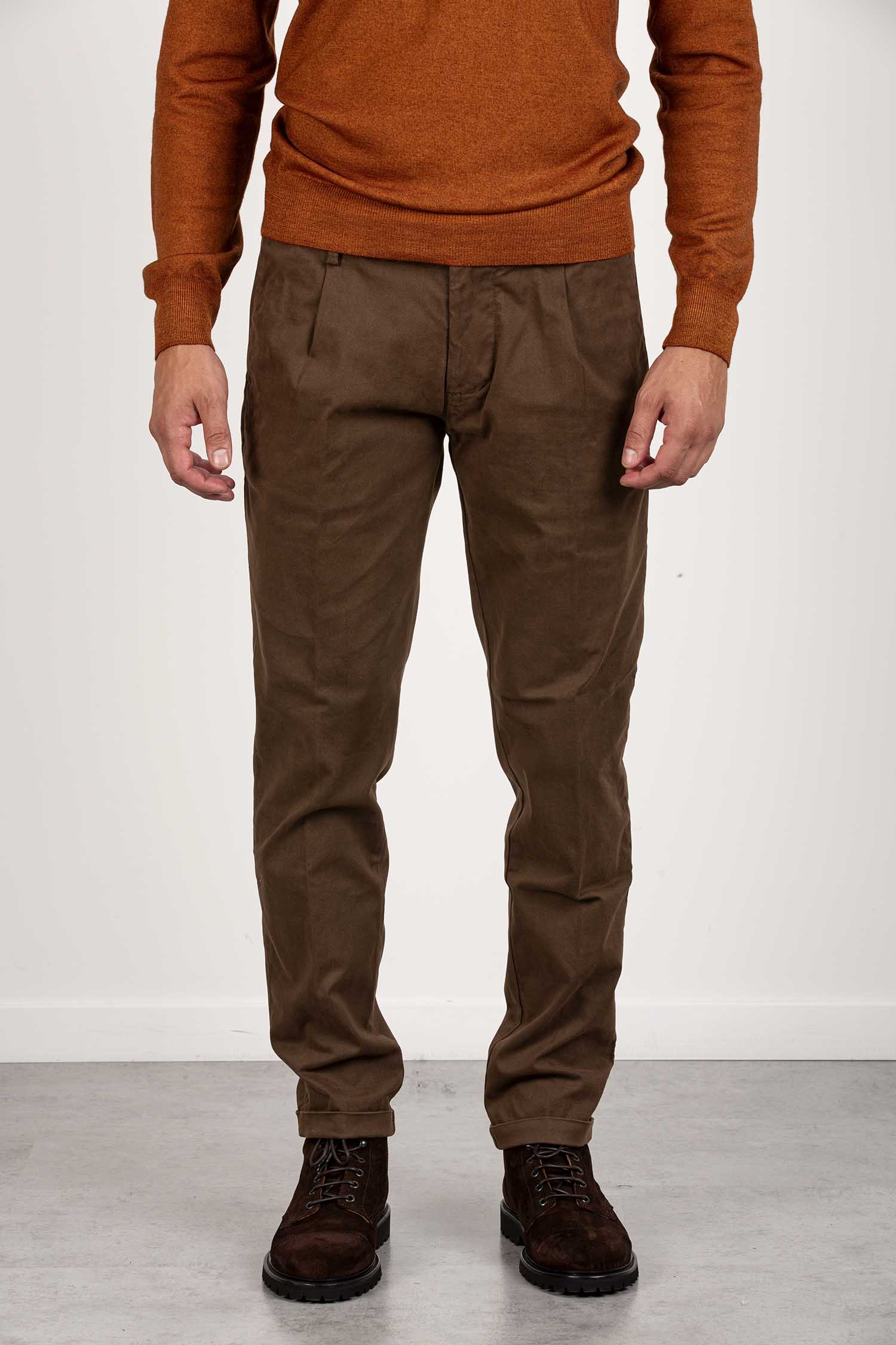 Pantalone chinos con pinces davanti, tasca davanti francese. Dettaglio risvolto da 2,5 cm fondo gamba.